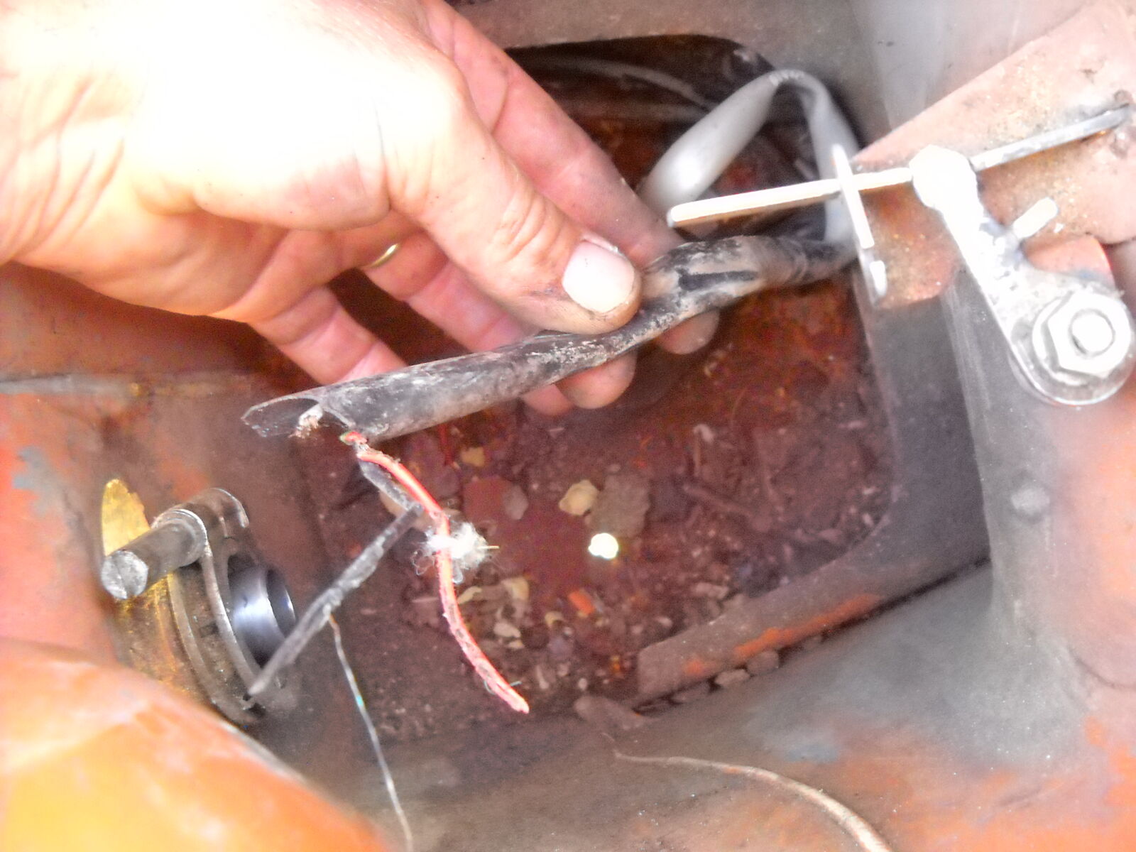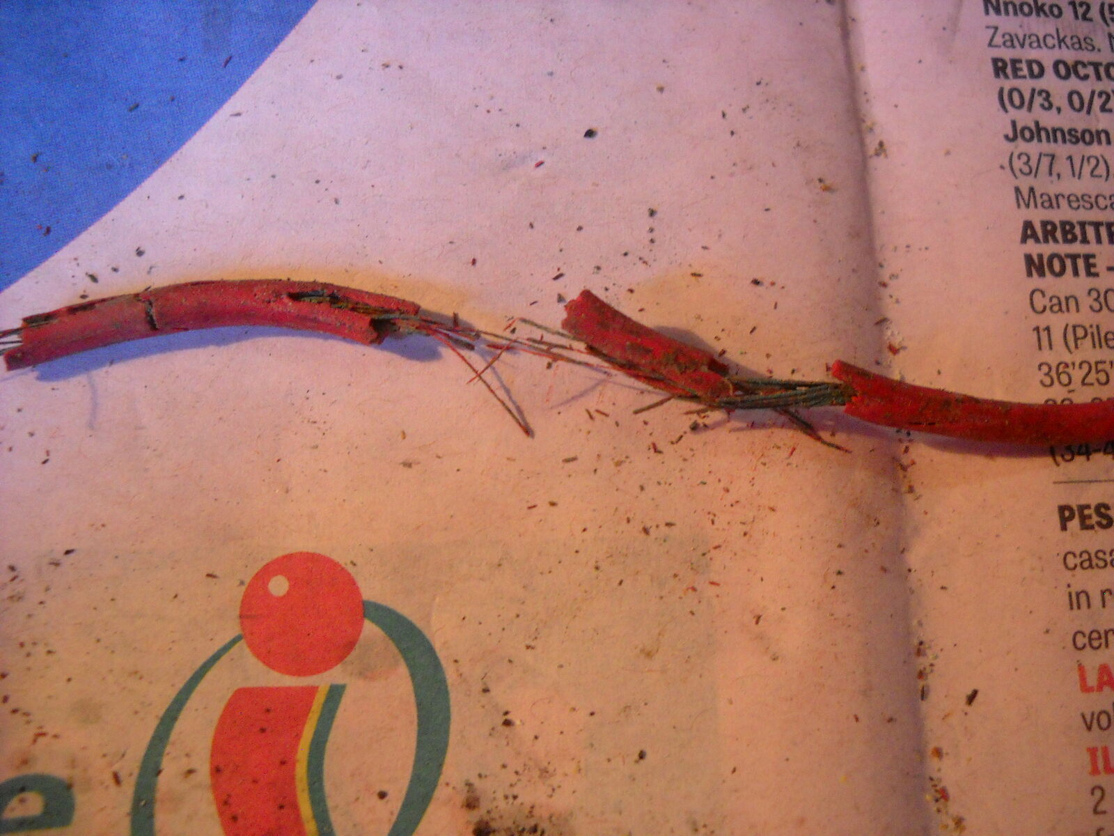 Also erst mal Unterbrecher neu machen, Zünkerze neu, Zündspule scheint o.k. zu sein....und zufällig beim leichten Anziehen des roten Kabels zur Ausenspule hab ichs gleich ganz in der Hand bzw. die Brösel..siehe Foto