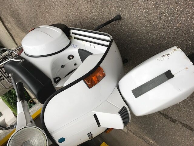 Die Vespa ist weiß, einfach nur weiß. Nicht ins cremefarbene, sondern eher gaaanz leicht grau abgetönt.