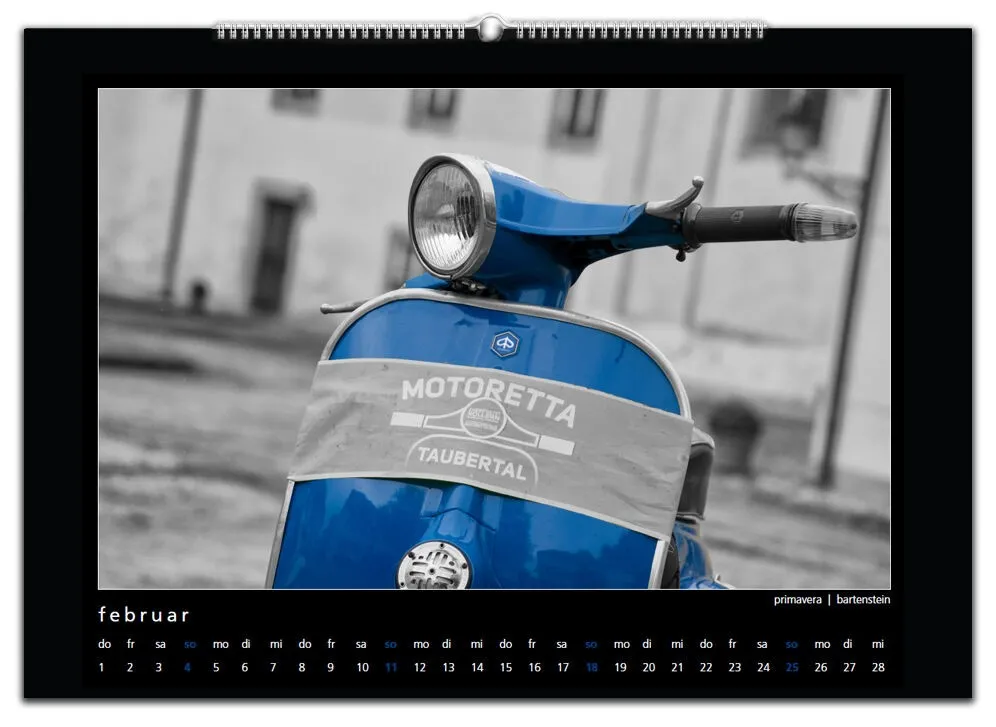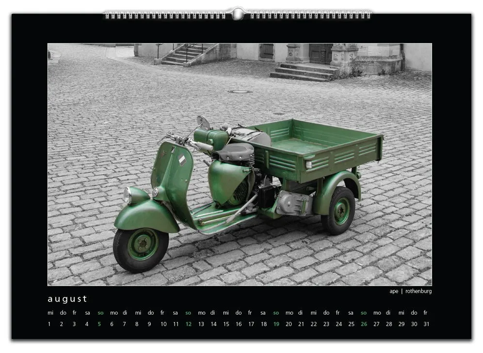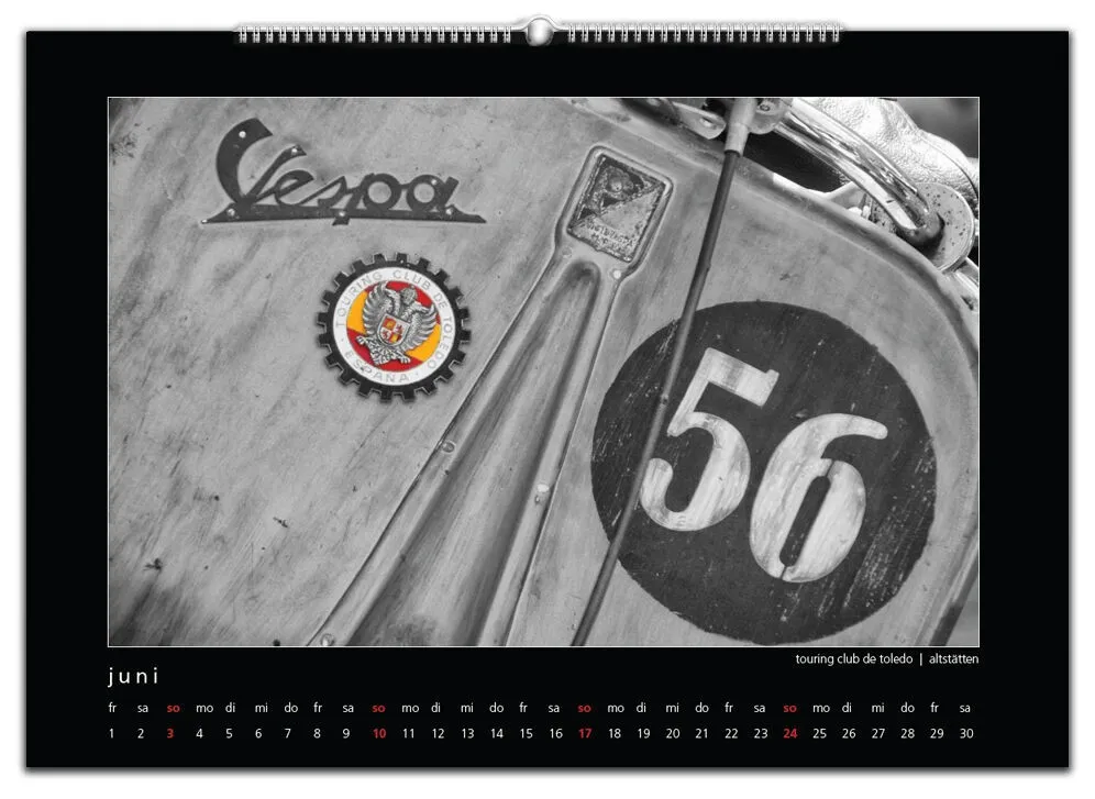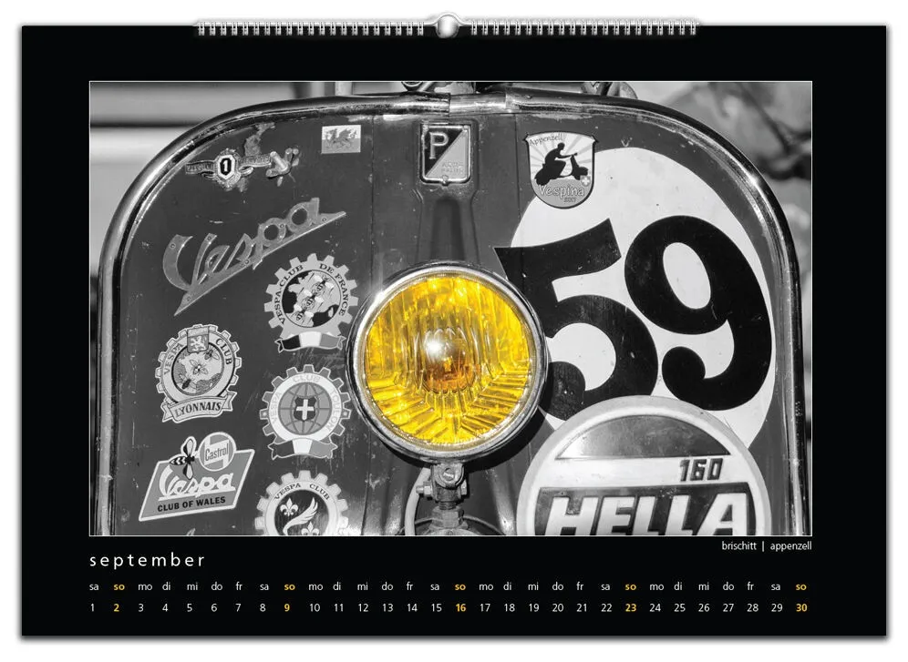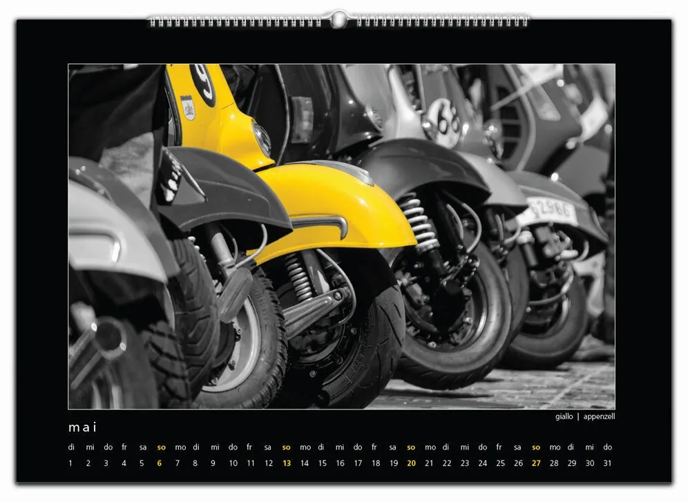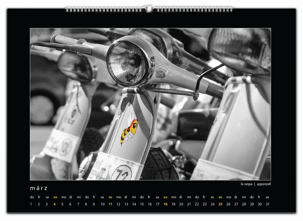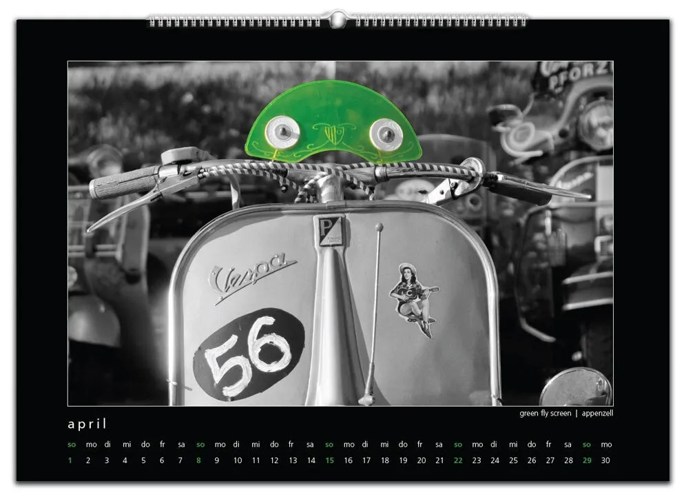 Die Motivauswahl ist heuer, wie gesagt, Schweiz-lastig. Warum? Weil ich im Mai vier Tage lang bei einem traumhaften Treffen im Appenzeller Land dabei sein durfte und dort einfach viel zu viele schöne Vespas zu sehen waren. Die "getroffenen" Roller stammen aber aus Deutschland, Österreich, Italien und aus der Schweiz. Somit ist es wohl mein internationalster Kalender bislang.