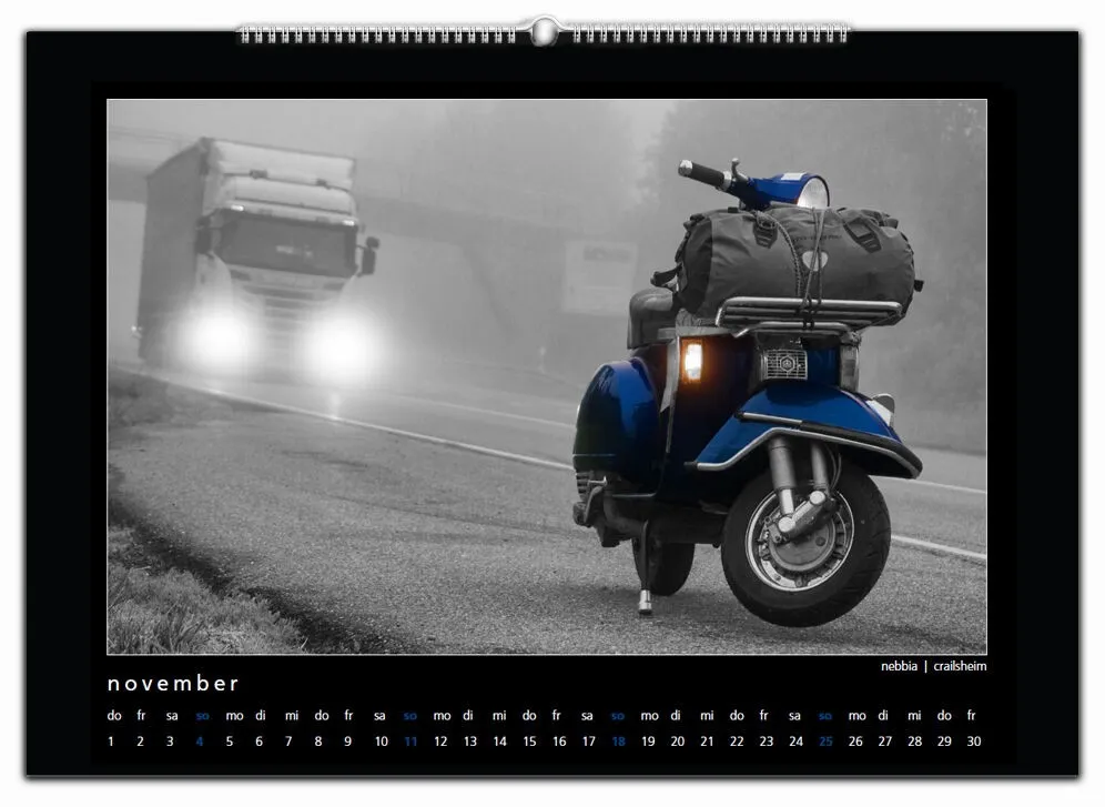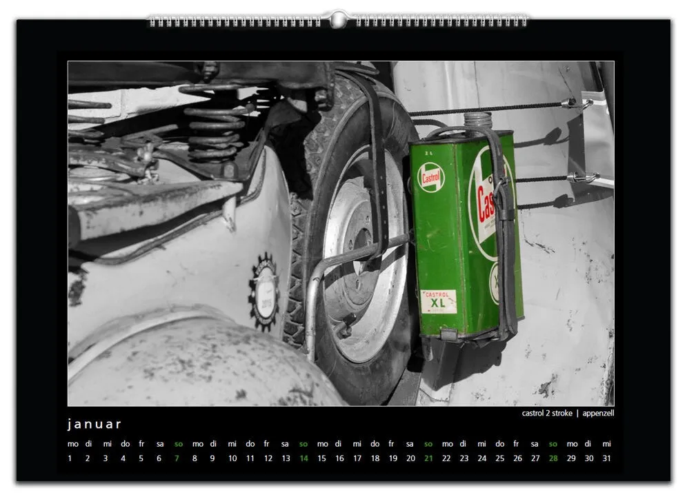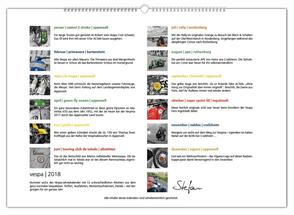 Alle Motive sind bei Treffen oder Ausfahrten enstanden, im Gegensatz zu anderen Technikkalendern ist also kein einziges gestelltes Bild dabei. Diesmal sind ziemlich viele Bilder aus der Schweiz dabei. Ich war über Himmelfahrt im Appenzeller Land zur Vespina 2017. Super Veranstaltung übrigens!