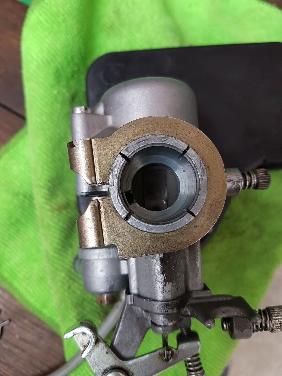 Es ist ein Dell Orto 16.16h Vergaser verbaut, und anscheinend gibt es da keine Gussschutzhülle am Ansaugstutzen, allerdings aber eine Gummitülle. Diese ist lose und lässt sich hin- und herschieben. Auch von einem Filzring ist nichts zu sehen.