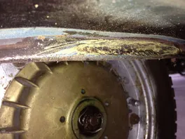 Nachdem die Nummer auch mit stundenlangem ausleuchten, abbeizen, vorsichtigem Abtragen der Farbreste nicht lesbar wurde (oder nur Teile davon), hat mir ein chemisch interessierter Freund die Formel für eine Walau-Lösung genannt. Mit der Lösung werden wahrscheinlich ähnlich den anderen Verfahren kaltverformte Metallstrukturen wieder sichtbar. Also ran da, erstmal so glatt wie möglich geschliffen. Dadurch verschwinden die sichtbaren Zahlen erstmal. Anschließend mit der Lösung 30 Minuten vorsichtig (32% Salzsäure macht Party mit deinem Augenlicht, anschließend ist es dauerhaft dunkel -.-) das Blech gestreichelt. Es lösten sich der restliche Rost und das Metall. Die Zahlen schimmerten zwischendurch recht klar auf und ich kam auf die Zahlenkombination.