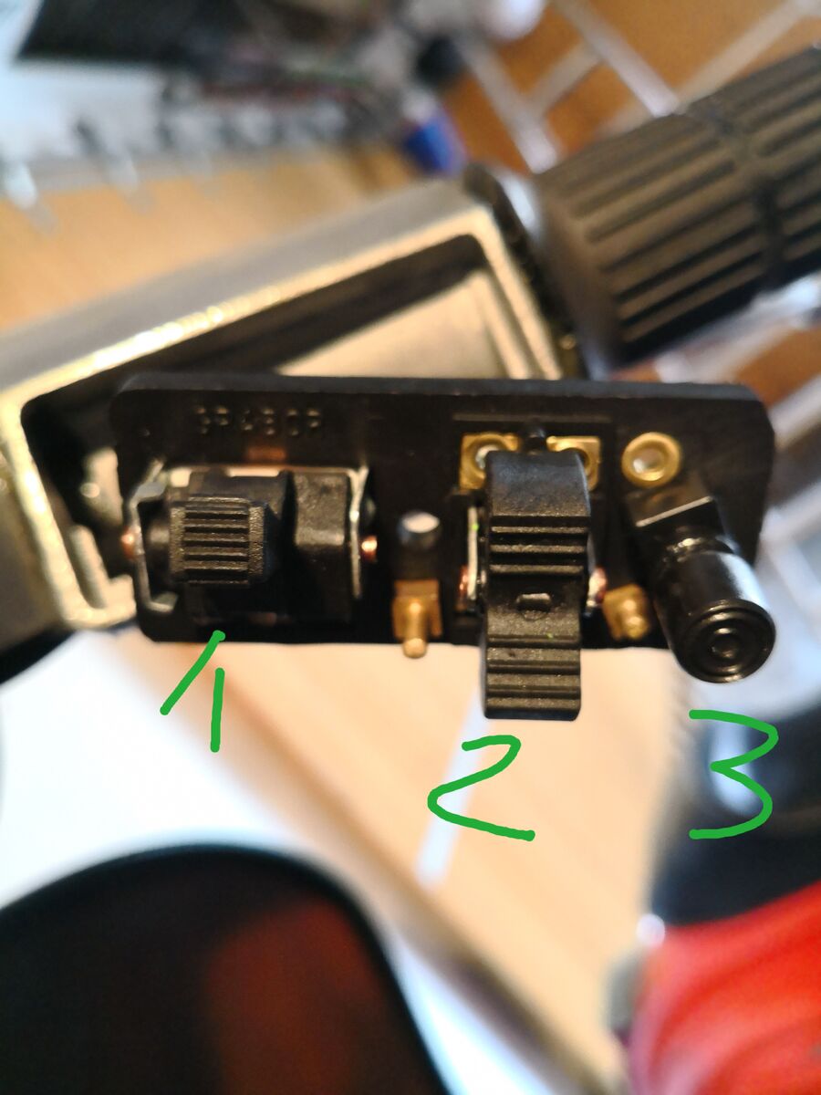Fehlen vielleicht die Gummitüllen und ev. auch der Rundstecker ? Mit Rundstecker und Tüllen ergibt sich die Zuordnung fast von selbst...