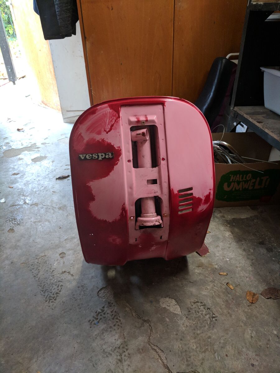 , und am Heck gibt's nen Ausschnitt für nen Auspuff. "Ansonsten" ist der Rahmen in einem top Zustand!! Das schöne Rosa wurde wahrscheinlich mit der Spraydose übertüncht. Der Malermeister hat sich aber nicht mal die Mühe gemacht irgendetwas abzubauen, geschweige denn den Lack anzuschleifen. Ich hab mit nem Lappen und etwas Aceton innerhalb von einer Minute am Beinschild ein schönes Stück freilegen können.