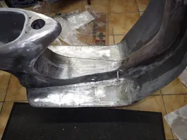Nachdem mir die Arbeit eh nicht zusagte hab ich mich mal auf das Bodenblech gestellt, denn das sollte es ja aushalten ohne abzubrechen. Und genau das hat es dann gemacht, ein Plong und die Schweißpunkte (Hartlot!!!) brachen alle nacheinander und ich stand auf dem Boden!!! :cursing::evil: Geile Arbeit, kann ich nur empfehlen. Das Blech war nicht mehr zu retten, weshalb ich es im vorderen Bereich wieder abflexte um ein Bodenblech mit Querstreben (wieder gekauft) anschweißen zu lassen. Da der Rahmentunnel bereits schei... aussah entschied ich mich zur Radikal-Befestigung. Der Schweißer (ein anderer) trennte den maroden Winkel des Tunnels ab, setzte einen neuen dran und verschweißte brutal das Bodenblech. Sah bescheiden aus, war aber stabil - allerdings war die Auflagekante des Originals nicht mehr zu sehen.