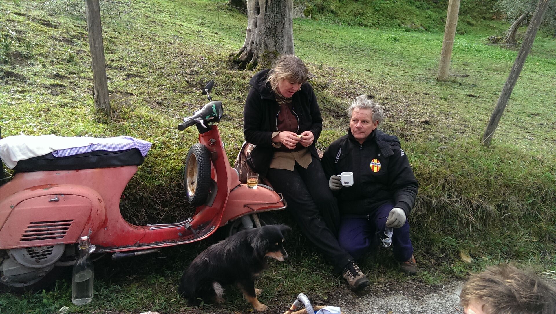 December 12, 2017 at 17:52 #1 Als nettes Beispiel für eine Vespa im Alltag- ein Eindruck : Eine wohlverdiente Pause während der Olivenernte, die Vespa dient als "Brotzeitbringer"....Und der Hund will auch was haben !