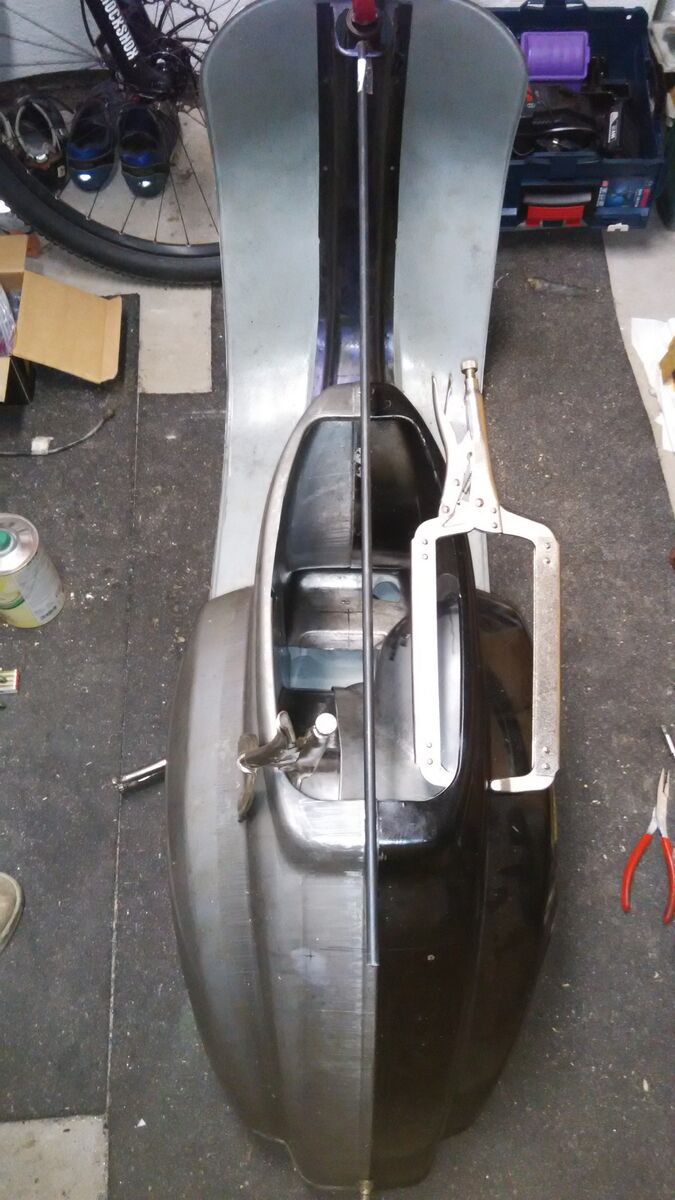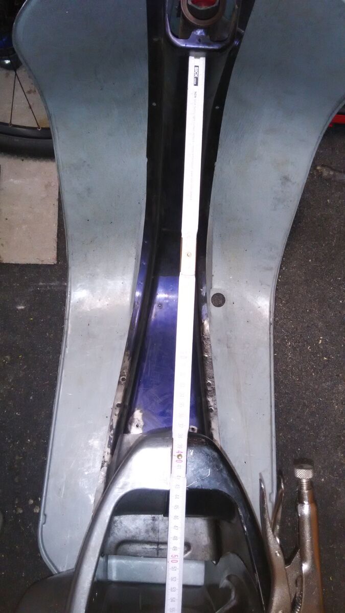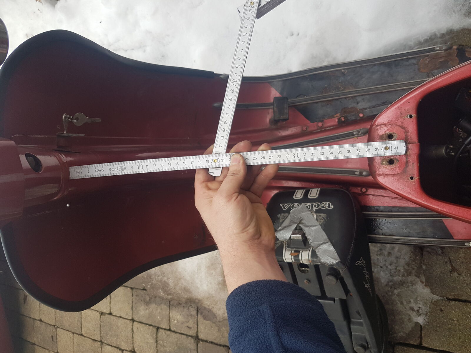 Über die Mitte der Vespa eine gerade Stange legen, hinten am Sitzbolzen über Mitte zwischen den Sattelschanierschrauben drüber bis vorn Richtung Lenker. Die Stange sollte dann vorn auf die Holmmitte treffen.