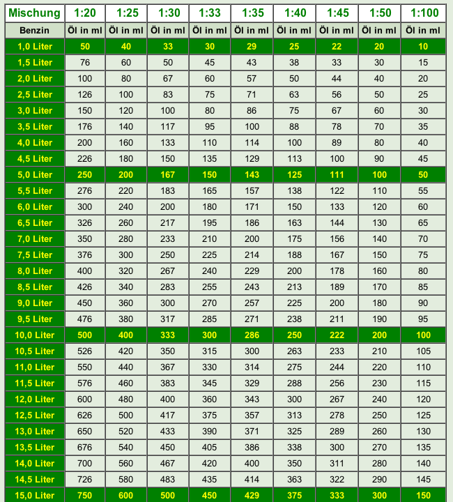 Mischung 1:16 1:18 1:20 1:25 1:30 1:33 1:35 1:40 1:45 1:50 1:100 Benzin Öl in ml Öl in ml Öl in ml Öl in ml Öl in ml Öl in ml Öl in ml Öl in ml Öl in ml Öl in ml Öl in ml 1,0 Liter 63 56 50 40 33 30 29 25 22 20 10 1,5 Liter 94 83 76 60 50 45 43 38 33 30 15 2,0 Liter 125 111 100 80 67 61 57 50 44 40 20 2,5 Liter 156 139 126 100 83 76 71 63 56 50 25 3,0 Liter 188 167 150 120 100 91 86 75 67 60 30 3,5 Liter 219 194 176 140 117 106 100 88 78 70 35 4,0 Liter 250 222 200 160 133 121 114 100 89 80 40 4,5 Liter 282 250 226 180 150 136 129 113 100 90 45 5,0 Liter 313 278 250 200 167 152 143 125 111 100 50 5,5 Liter 344 306 276 220 183 167 157 138 122 110 55 6,0 Liter 375 333 300 240 200 182 171 150 133 120 60 6,5 Liter 406 361 326 260 217 197 186 163 144 130 65 7,0 Liter 438 391 350 280 233 212 200 175 156 140 70 7,5 Liter 469 417 376 300 250 227 214 188 167 150 75 8,0 Liter 500 444 400 320 267 242 229 200 178 160 80 8,5 Liter 531 472 426 340 283 258 243 213 189 170 85 9,0 Liter 563 500 450 360 300 273 257 225 200 180 90 9,5 Liter 593 528 476 380 317 288 271 238 211 190 95 10,0 Liter 625 556 500 400 333 303 286 250 222 200 100 10,5 Liter 656 583 526 420 350 318 300 263 233 210 105 11,0 Liter 688 611 550 440 367 333 314 275 244 220 110 11,5 Liter 719 639 576 460 383 348 329 288 256 230 115 12,0 Liter 750 667 600 480 400 364 343 300 267 240 120 12,5 Liter 781 694 626 500 417 379 357 313 278 250 125 13,0 Liter 813 722 650 520 433 394 371 325 289 260 130 13,5 Liter 844 750 676 540 450 409 386 338 300 270 135 14,0 Liter 875 778 700 560 467 424 400 350 311 280 140 14,5 Liter 906 806 726 580 483 439 414 363 322 290 145 15,0 Liter 938 833 750 600 500 455 429 375 333 300 150 15,5 Liter 969 861 776 620 517 470 443 388 344 310 155 16,0 Liter 1000 889 800 640 533 485 457 400 356 320 160 16,5 Liter 1031 917 826 660 550 500 471 413 367 330 165 17,0 Liter 1063 944 850 680 567 515 486 425 378 340 170 17,5 Liter 1094 972 876 700 583 530 500 438 389 350 175 18,0 Liter 1125 1000 900 720 600 545 514 450 400 360 180 18,5 Liter 1156 1028 926 740 617 561 529 463 411 370 185 19,0 Liter 1188 1056 950 760 633 576 543 475 422 380 190 19,5 Liter 1219 1083 976 780 650 591 557 488 433 390 195 20,0 Liter 1250 1111 1000 800 667 606 571 500 444 400 200 -