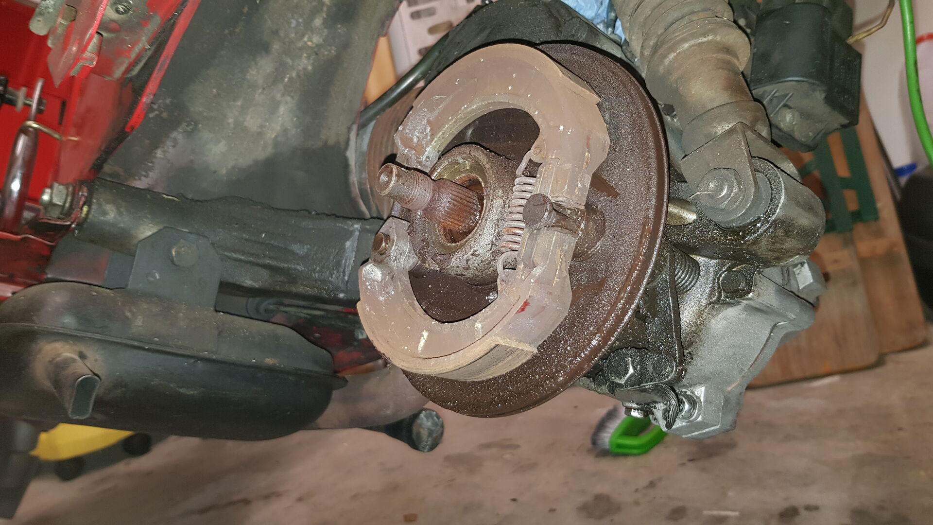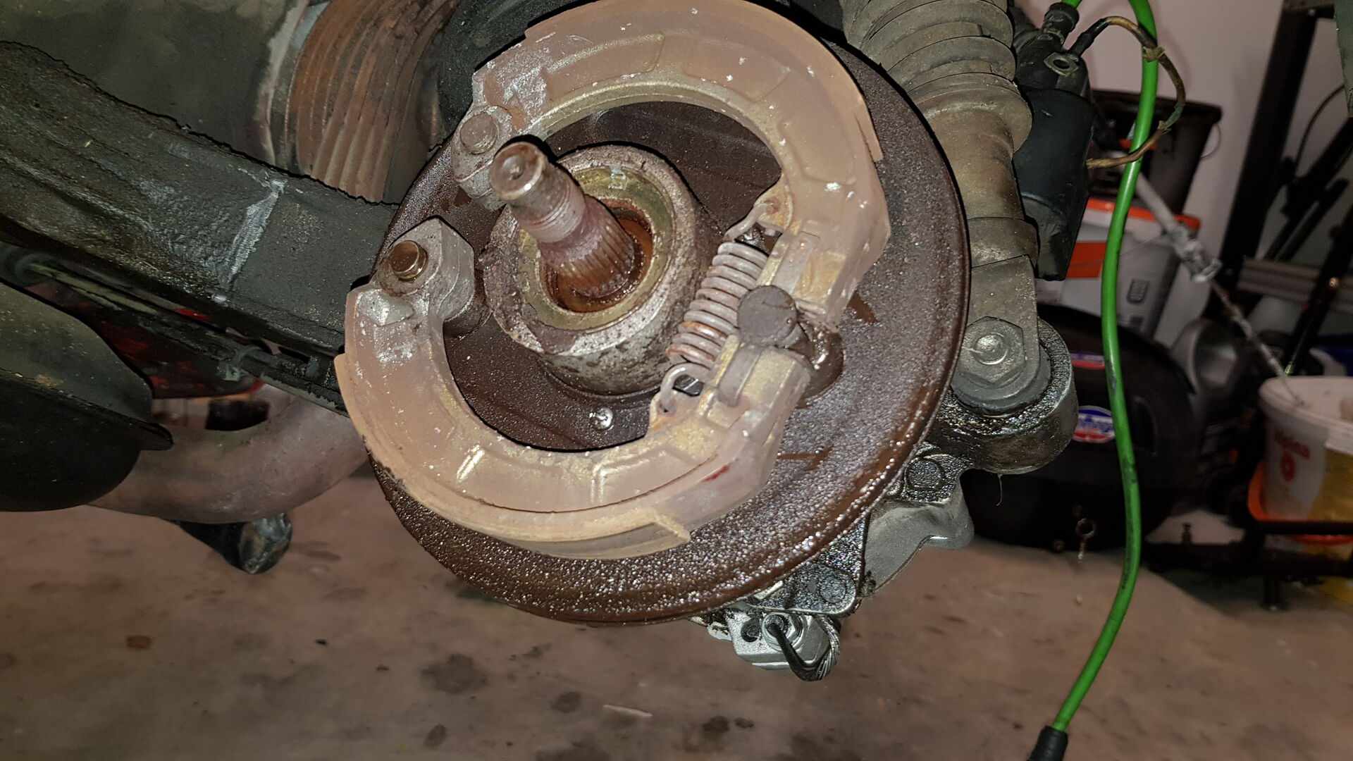 Da sie fast 10 Jahre nur rumgestanden hat, bin ich dabei sie wieder auf Vordermann zu bringen. Vergaser ist schon neu abgedichtet und eben haben ich die Bremse runter hinten, um die Beläge zu wechseln. Mir ist schon aufgefallen, dass der Kupplungsdeckel und auch die Schwinge stark mit altem Öl zugesifft ist. Nachdem ich die Bremstrommel runter hatte, sah es innen nicht besser aus, alles total verölt.