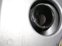 Ein Foto zeigt den Bolzen, der durch das Steuerrohr (ohne Fräsung an der richtigen Stelle) nicht weiter hinein geht. Bei dem nächsten Foto sieht man das Steuerrohr, welches in dieser Stellung die Ausfräsung zeigen müsste, damit der Bolzen hineingreift. Tut es aber nicht !