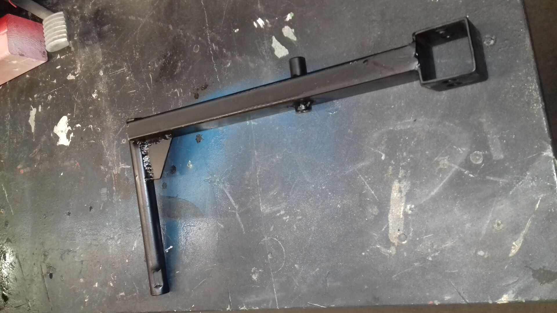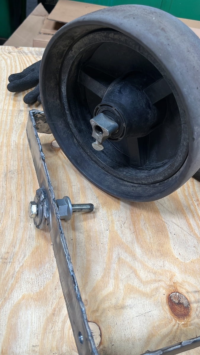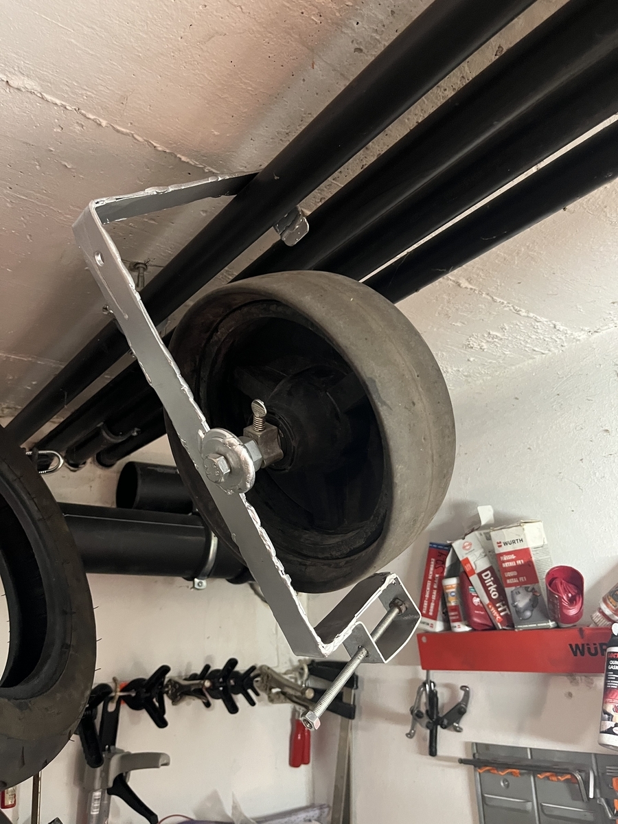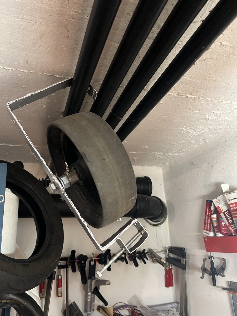 Ich nehme dafür ein altes Rohr von den Schwingenlagern. Das passt schon mal genau in die originale Position. Daran schweisse ich einen Winkel (90 Grad ) und an den einen weiteren zur Aufnahme des Stoßdämpfers. Dann in Radposition eine Bohrung setzen und ein Schubkarrenrad befestigen.