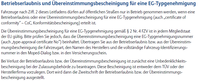 ich bin seit Samstag Besitzer einer PK 50 XL von 1990. Das Fahrzeug hat italienische Papiere und ist aber vom Vorbesitzer in Deutschland schon versichert. Ist das denn überhaupt so OK oder muß ich um den Vorschriften zu entsprechen eine deutsche Betriebserlaubnis besorgen. Wenn ja, bekomme ich die gegen die italienische bei Piaggio ?