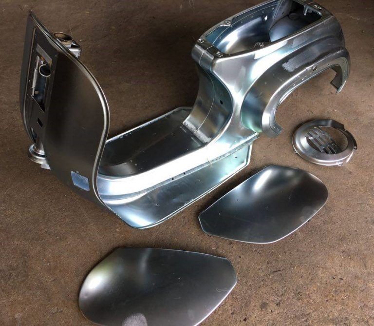 Nachdem wir die Vespa komplett zerlegt haben, wurden die Bauteile die später eine neue Lackierung bekommen sollen, chemisch entlackt. Das chemische Entlacken ist schonender für das dünne Vespablech als das Sandstrahlen. Durch unsere speziellen Tauchbäder ist es möglich Stahlteile als auch Aluminiumteile von Lackschichten zu befreien. Anschließend haben wir die entlackten Bauteile galvanisch verzinkt und passiviert. Das sorgt für einen optimalen Korrosionsschutz und Haftgrund. Kosten der Oberflächenarbeiten (entfetten, entlacken, entrosten, verzinken) 300,00€.
