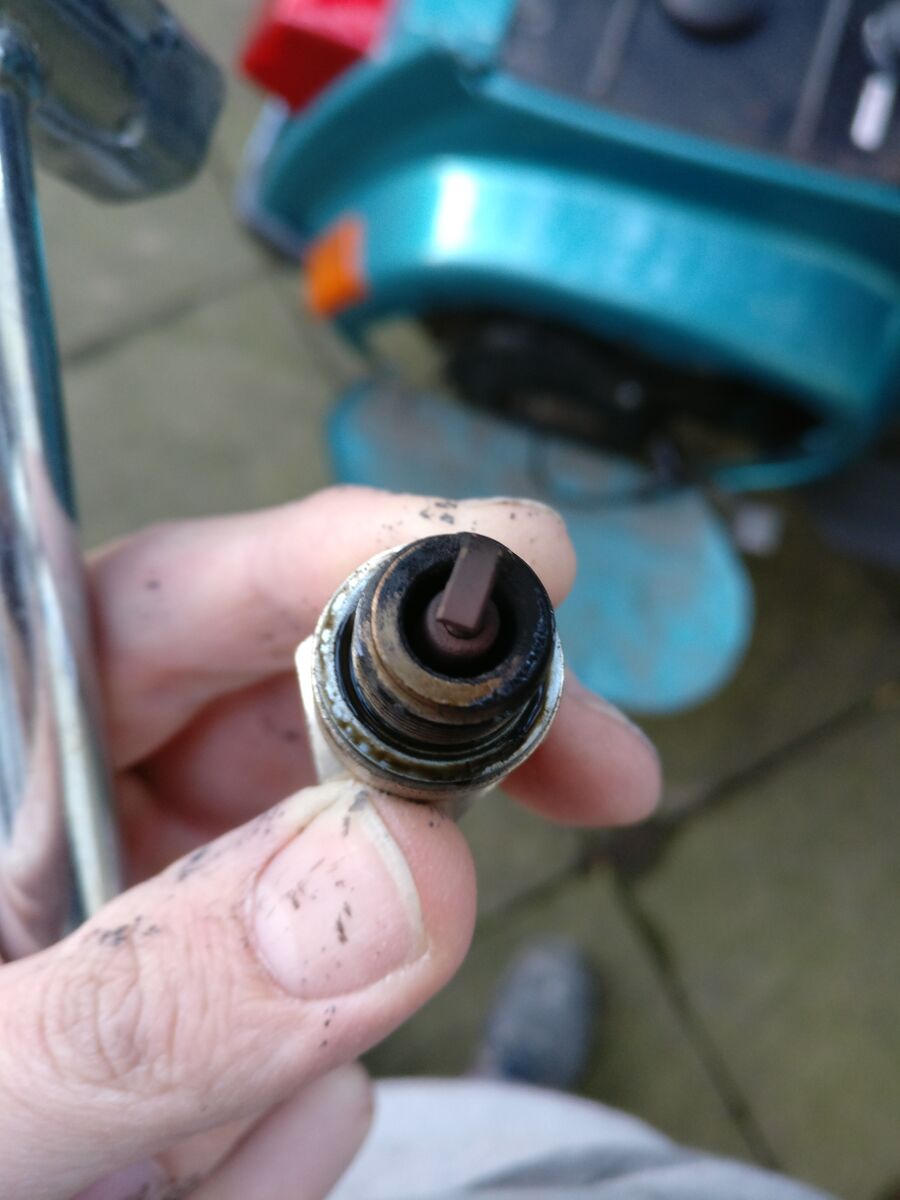 Bin nen paar Kilometer gefahren. Im ersten Versuch lief sie viel zu fett. Nun könnte man schon von nem braunen Kern der Zündkerze reden, aber drumrumm schwarz. Bin Bild vom aktuellen Krzenbild füge ich mal bei. Auch merkt man, dass wenn ich die Gemischschraube reindrehe, sie an Vmax verliert. Bei ca 2 Umdrehungen raus -> 58/60 laut Tacho, bei einer Umdrehung -> ca 50.