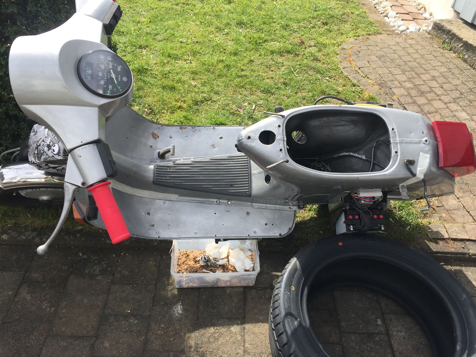 Dann erstmal Mittagessen. Zurück in der Garage dann der Schock, alles mit Öl ein eingesaut. Garage Vespa einfach alles.