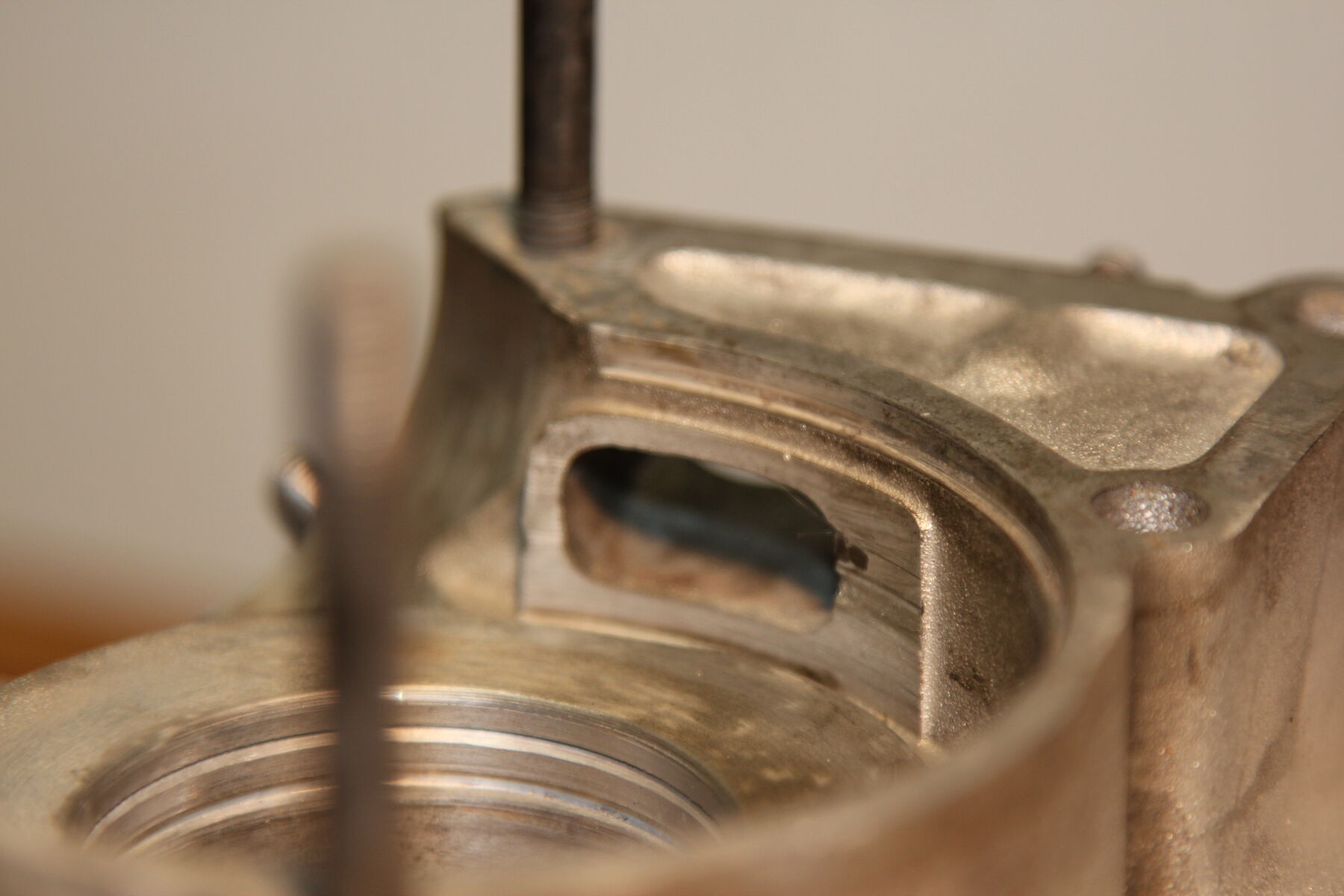 Da eh auf Membran umgebaut wird, kann man eine schöne Membranwelle verbauen.Im Kurbelgehäuse auf Höhe der Motorbolzenbohrung ist ein Schlitz, und aus Sicht der Nebenwelle dieses Loch...das sieht nach einem Gußlunker aus, eine Fehler, der beim Gießen des Gehäuses passiert ist.