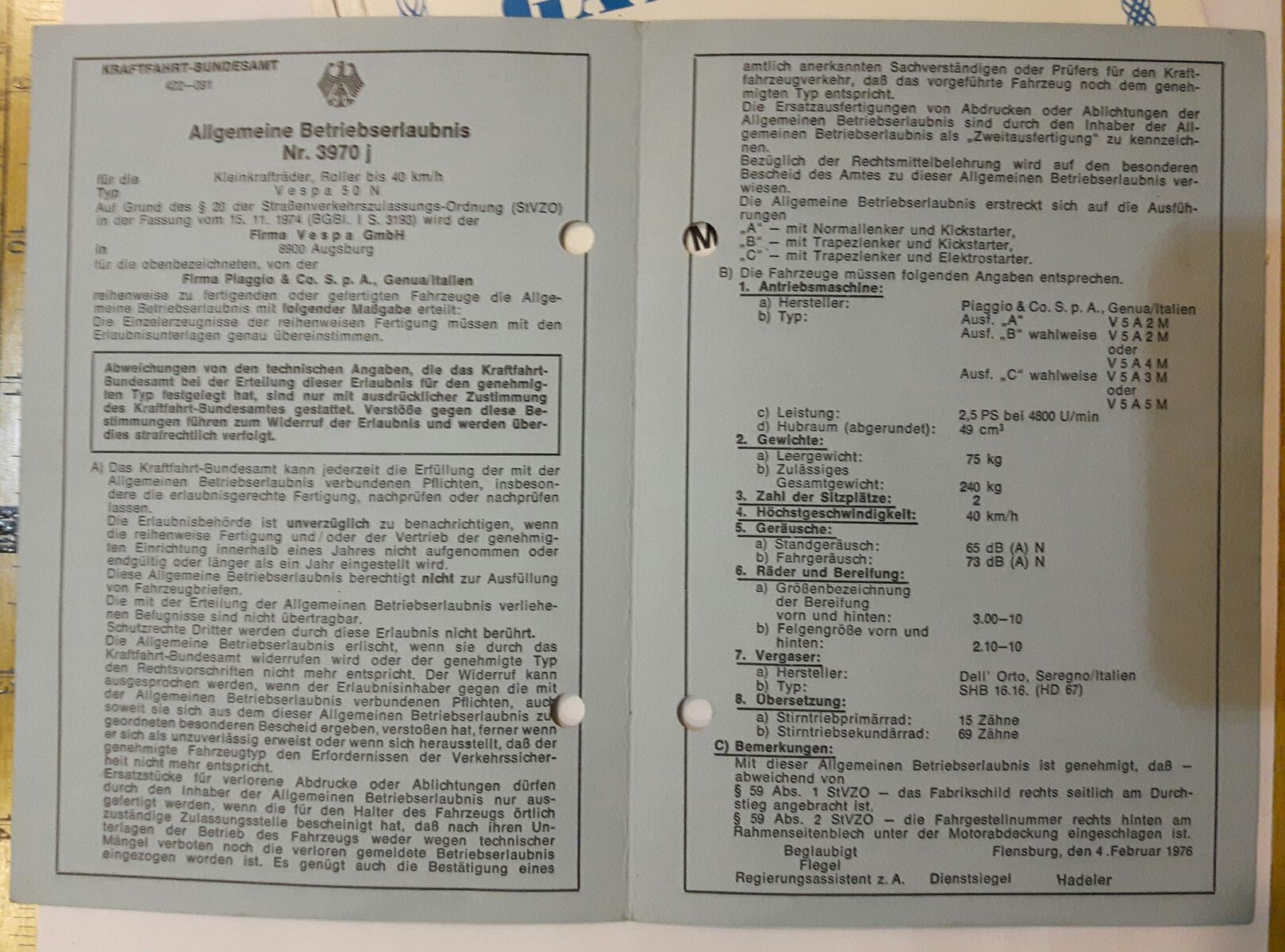 hab eine italienische V5B3T Ez. 76 mit ital. Papieren und benötige nun für den TÜV Mensch eine Datenbasis also quasi die ABE oder Zulassung oder Datenblätter einer in D zugelassenen V5B3T.