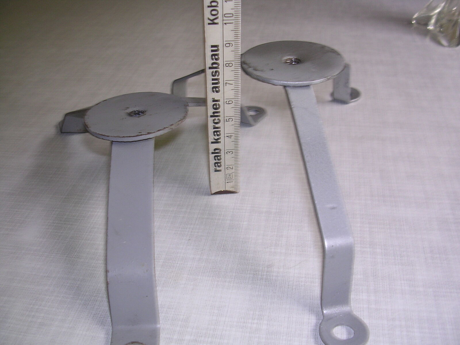 Habe mir zwischenzeitlich selbst geholfen. Beim Bauhof eine 15mm breite u. 2mm dicke Aluleiste gekauft (1,60 €). Dann an einer noch vorhandenen Befestigung Maß genommen, die 3 Arme gebogen, gebohrt u. mit Popnieten an der oberen runden Scheibe befestigt (diese habe ich von einer kleineren Befestigung genommen , vorher die 3 Arme abgetrennt). Mit Rostschutzfarbe gesprüht; passt wackelt u. hat Luft !