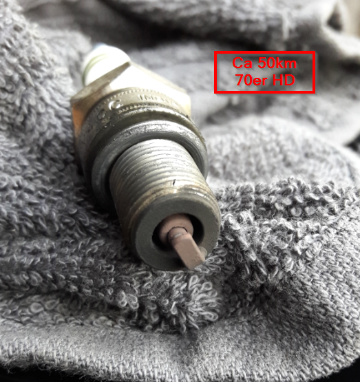 Kerze war mit 74er HD schwarz und feucht - mit 72er auch noch, mit 70er HD nach einigen Kilometern braun (siehe Foto 1 - Kerze trocken weil kalt ausgebaut)