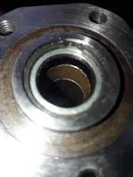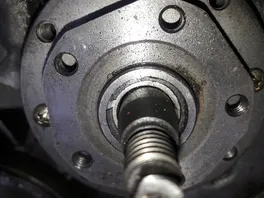Nun folgende Frage zum weiteren Ausbau. Ich moechte schon gern die Freilaufeinrichtung begutachten. Im Bild ist der jetzige Status zu sehen. Die Scheibe traegt die Kupplung, in der "Dose" dahinter sitzt der Freilauf, denke ich. Ich bin mir nicht im Klaren darueber, ob ich die beiden Einheiten einzeln abziehen kann, oder die beiden Teile zusammen (falls die Scheibe plus Gewinde von hinten mit einem Sprengring gesichert ist)- moechte nichts kaputtmachen. Wie ist die richtige Vorgehensweise?