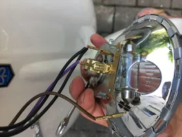 Die Kontaktzungen sind nur aus Messingblech. Sie müssten aber aus einem dauerhaft federelastischen Material sein (z.B. Phosphorbronze so wie die Kontaktzungen der Originalscheinwerfer), um einen zuverlässigen Stromschluß zu den Kontaktpunkten auf der Birne zu gewährleisten. Auch sind die Kontaktzungen am Scheinwerferstecker instabil vernietet (lass mich raten...man kann dran herumdrehen?).