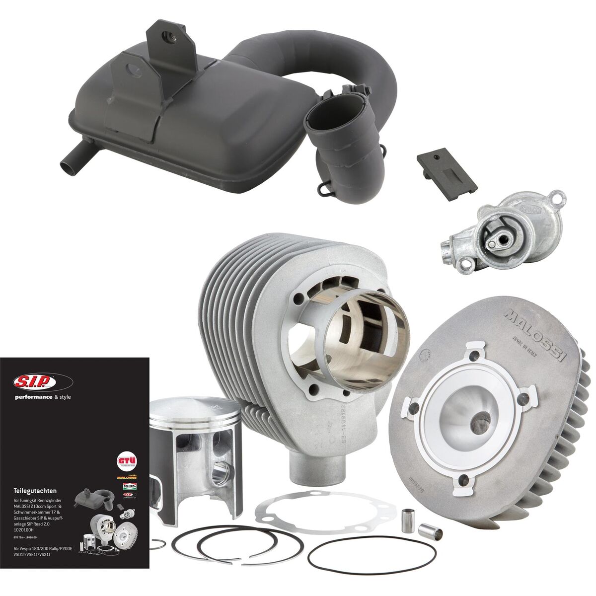 Für die Teilegutachten-Tuningkits haben wir die Lieblings-Kombinationen des SIP Teams und vieler Kunden ausgewählt. Es sind echte Up-Grades für die betagten Konstruktionen der Vespa-Motoren. Ob mit SIP Road oder unserem klassischen SIP Performance Resonanzauspuff - die Kits sind immer deutlich sportlicher als das Original, aber dennoch tourenfreundlich und geräuscharm, teils durch doppelwandigen Auspuff und mit genug Bodenfreiheit und harmonischer, früher Leistungsentfaltung. Enthalten sind auch viele wirkungsvolle Kleinteile wie die Schwimmerkammer mit größerem Nadelventil und der besondere Gasschieber, mit denen der Einstieg auch jenen gelingt, die nicht im Detail mit Feintuning vertraut sind.