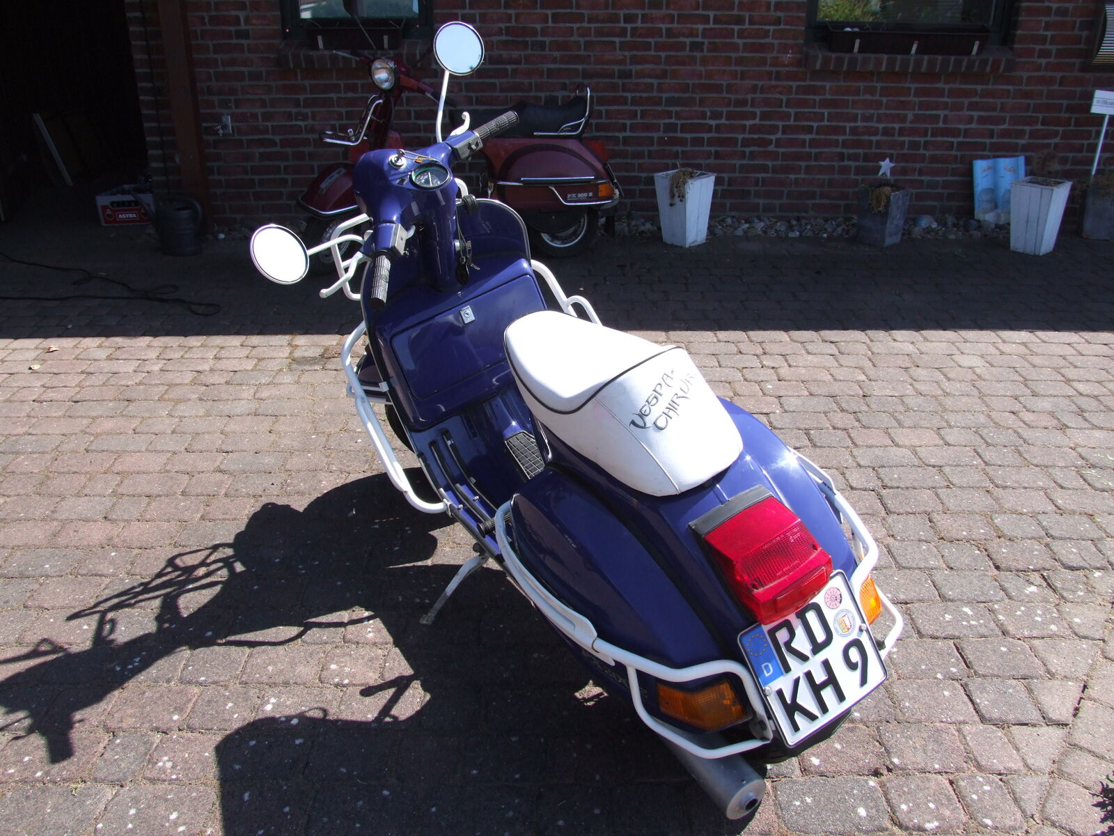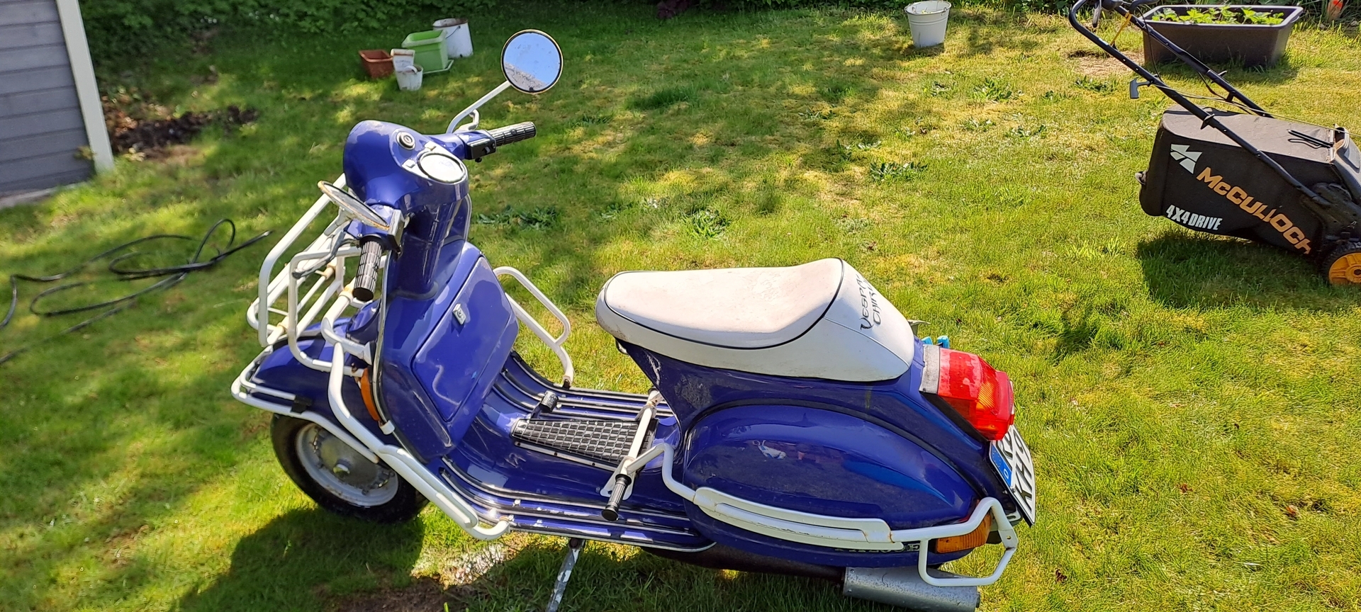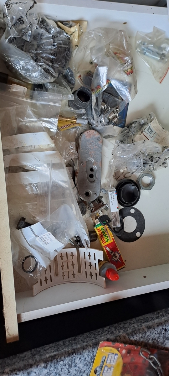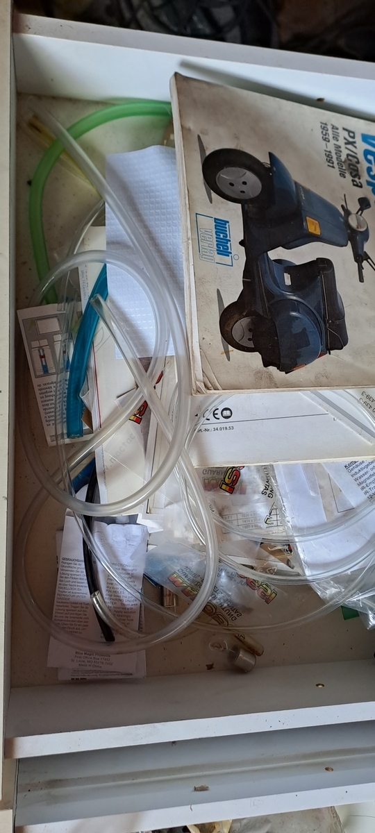 Die im Hintergrund zu sehene rote Px, wird auch verkauft. Aber die soll erst noch mal chic gemacht werden. Die anderen Vespaklamotten, wie JL, Drehzalmesser, zig Lager, Züge, original Kurbelwelle und und und kommen die Tage rein.