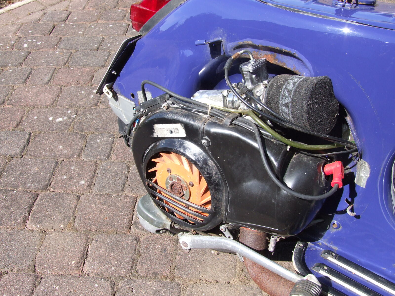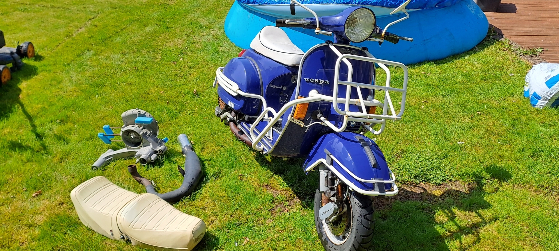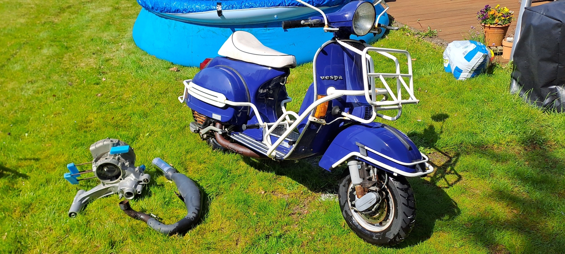 Die im Hintergrund zu sehene rote Px, wird auch verkauft. Aber die soll erst noch mal chic gemacht werden. Die anderen Vespaklamotten, wie JL, Drehzalmesser, zig Lager, Züge, original Kurbelwelle und und und kommen die Tage rein.