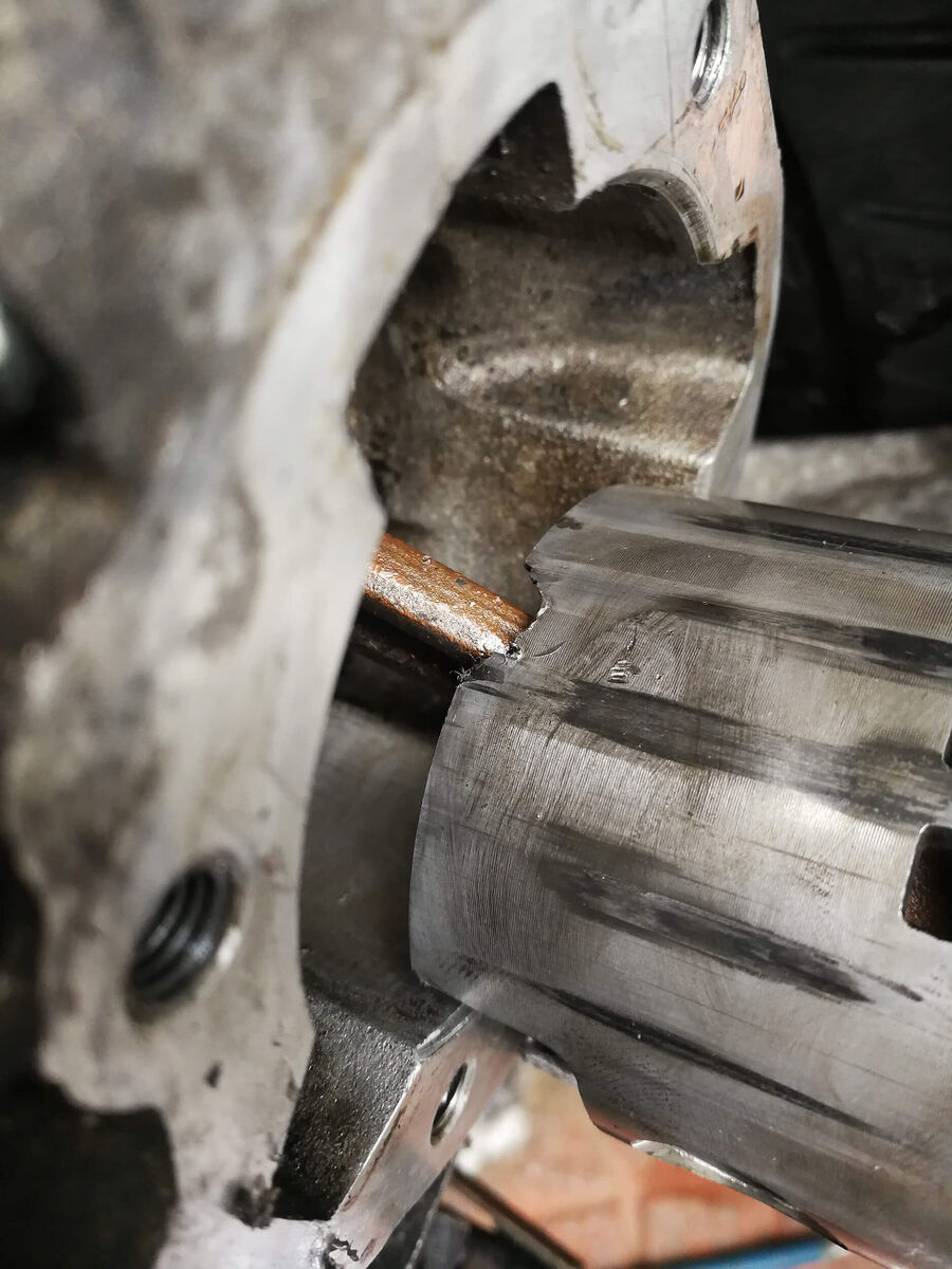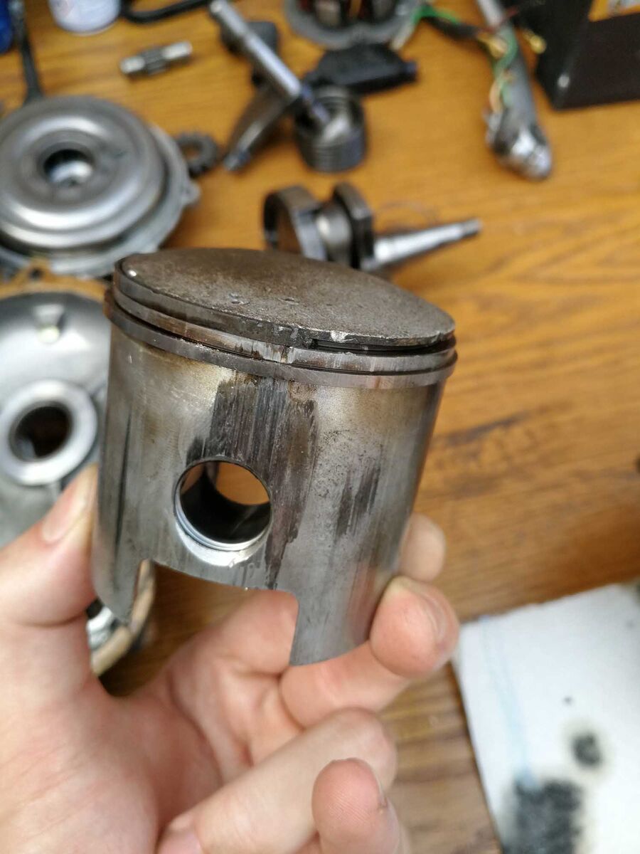 Die marode Kurbelwelle hat sich scheinbar tlw. zerlegt (oder irgendwas rumgeschleudert), was letztlich den Kolben seitlich erwischt und den oberen Kolbenring zerschlagen hat. Letzterer hat sich dann in kleinen Stückchen durch den Zylinder in den Pott verabschiedet. Zylindergehäuse ist in Top Zustand, Kolben nicht mehr wirklich...