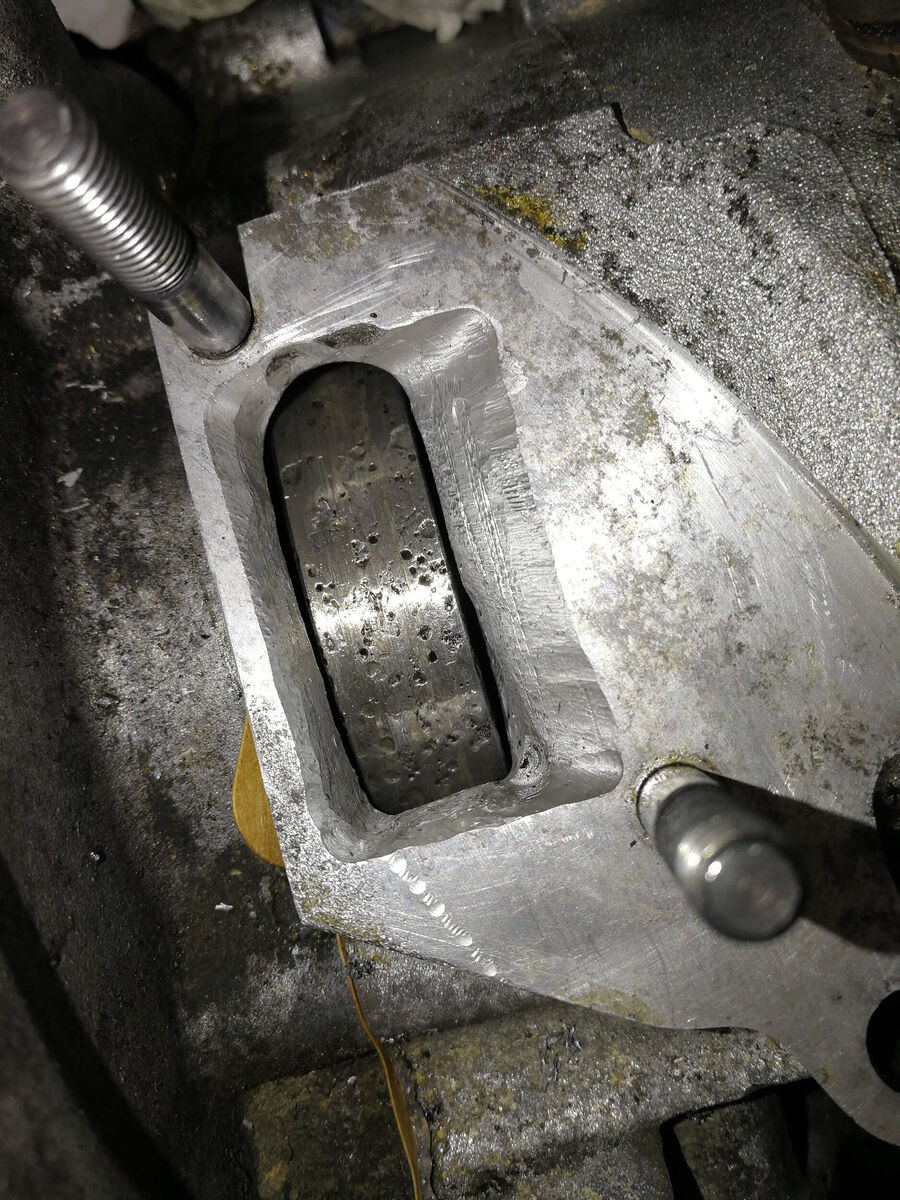 Was meint ihr zur Kurbelwelle? Sieht interessant aus, hm? Und was hatte man wohl mit dem super professionell größer gefrästen Einlass vor? Bringt sicher drölf PS ![]()