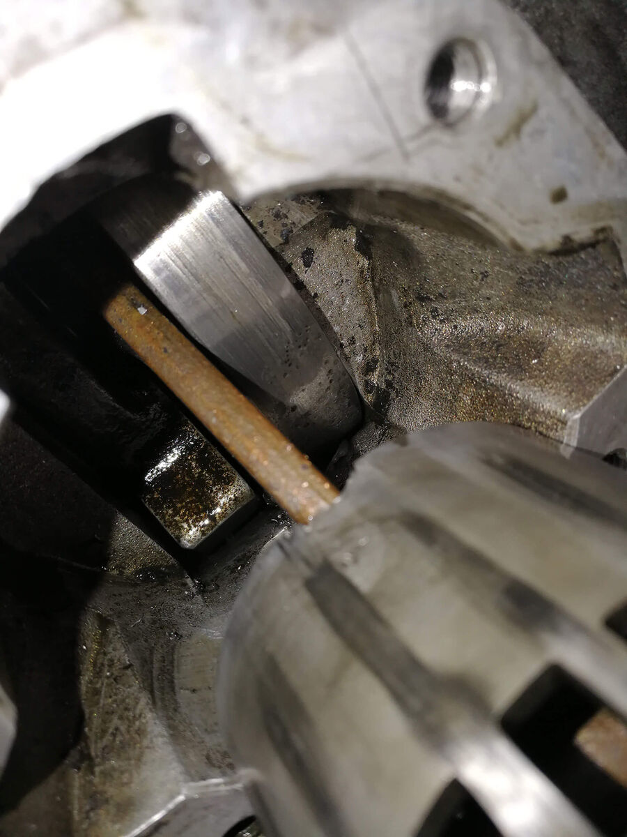 Der Motor muss in jedem Fall gespalten werden, Metallspähne haben sich richtig schön verteilt und die Kurbelwelle werde ich nie im Leben weiter verwenden. Richtig abgefressen.