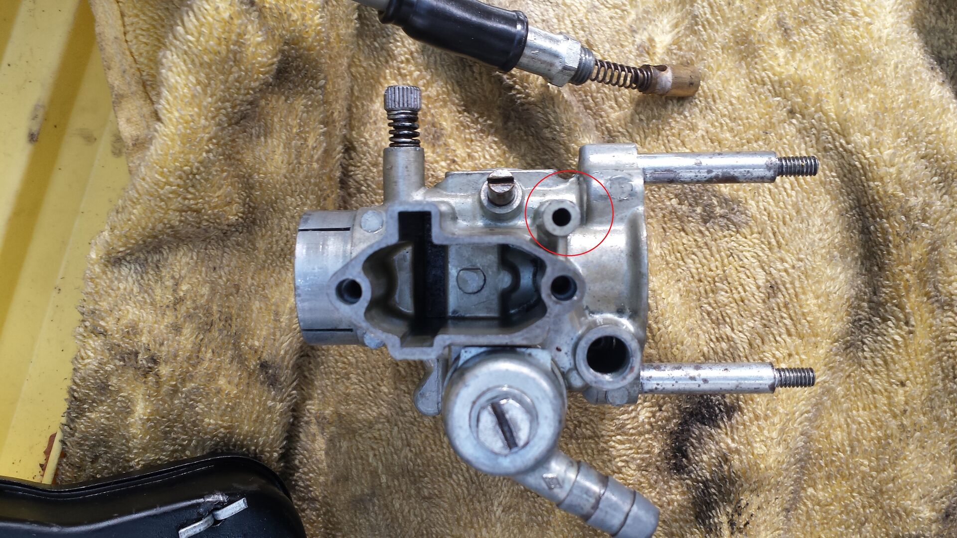 Habe dann den Vergaser rausgemacht und wollte nachsehen warum sie ständig absäuft. Es ist mit dann das Benzin aus dem ausgebauten Vergaser gleich über die Flossen gelaufen. Sind nicht alle Öffnungen am Vergaser verschlossen? Ich habe 2 Stellen gefunden wo das Benzin rausläuft. (Siehe Bild)
