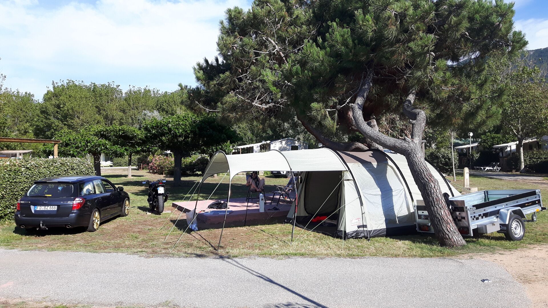 Zwar in einem Ferienhaus mitten im Nirgendwo zwischen einer Olivenplantage, aber für den Rückweg hatten wir doch nochmal unser altes Zelt dabei zum Zwischennächtigen.