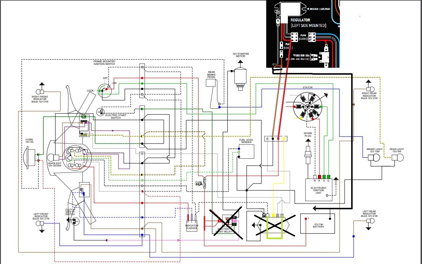 Dann ist es aktuell ja so, das mein Licht nur geht wenn der Motor läuft. Blinker und Hupe so wie Tankanzeige funktionieren wenn Zündung an da sie über die Batterie bzw. DC laufen. Welcher Ausgang des originalen Spannungsreglers ist welcher Kreis?