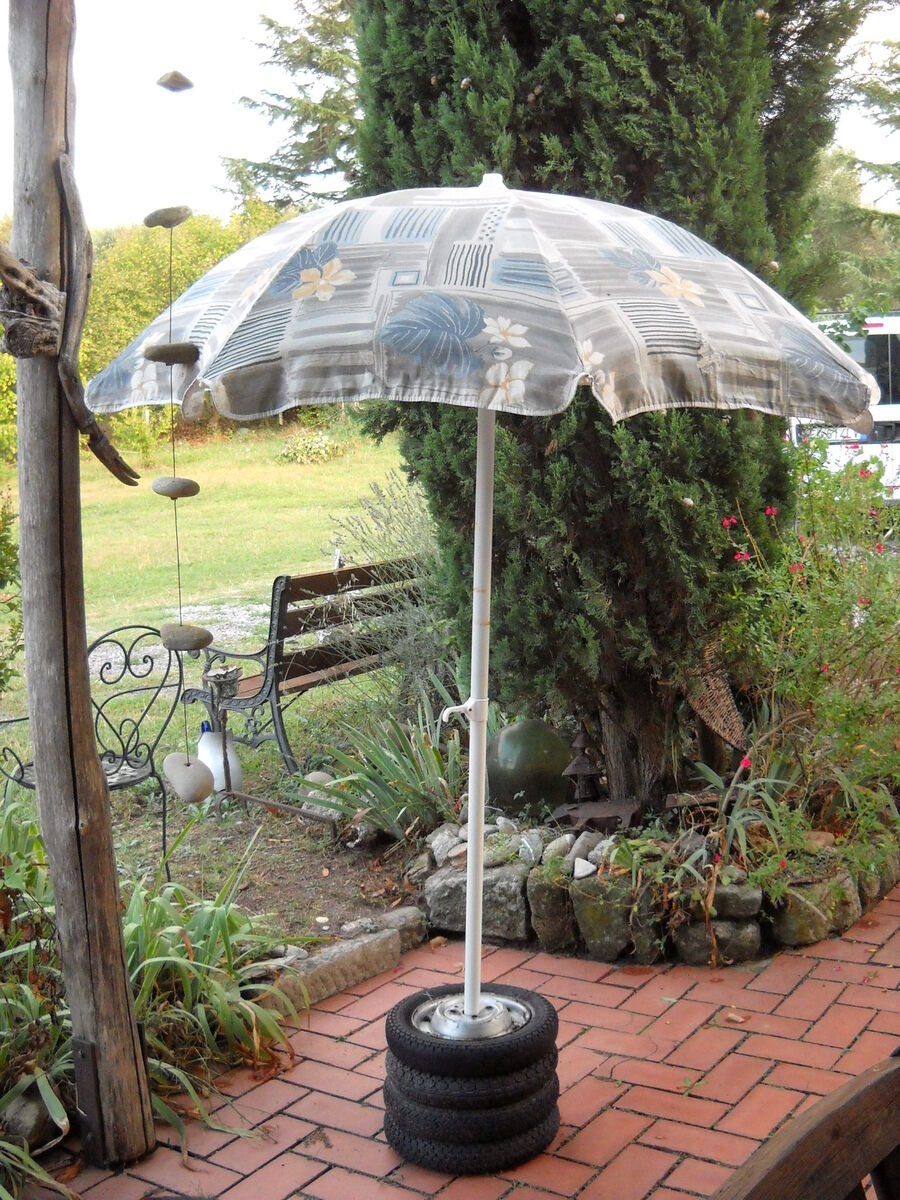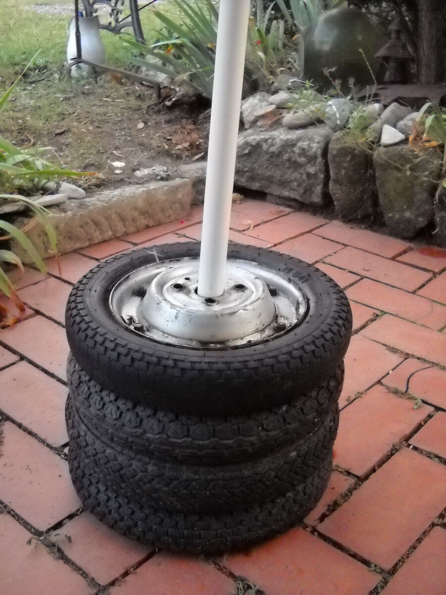 Im Sommer brauchte einer meiner Gäste mehr Schatten auf der Veranda und hatte den genialen Einfall, aus meinen reichlich vorhandenen Felgen mit Reifen der V50 N im Nu einen perfekten und stabilen Schirmständer zu basteln-