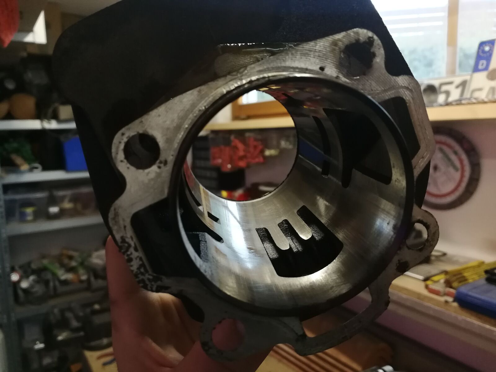 Die Schieberdichtfläche macht einen sehr guten Eindruck. Keine Beschädigungen. Vereinzelt ein paar Mikroriefen. Kein Problem. Eventuell (je nach Kurbelwelle und Vergaser) lohnt es sich später den Einlass noch ein wenig zu modifizieren.