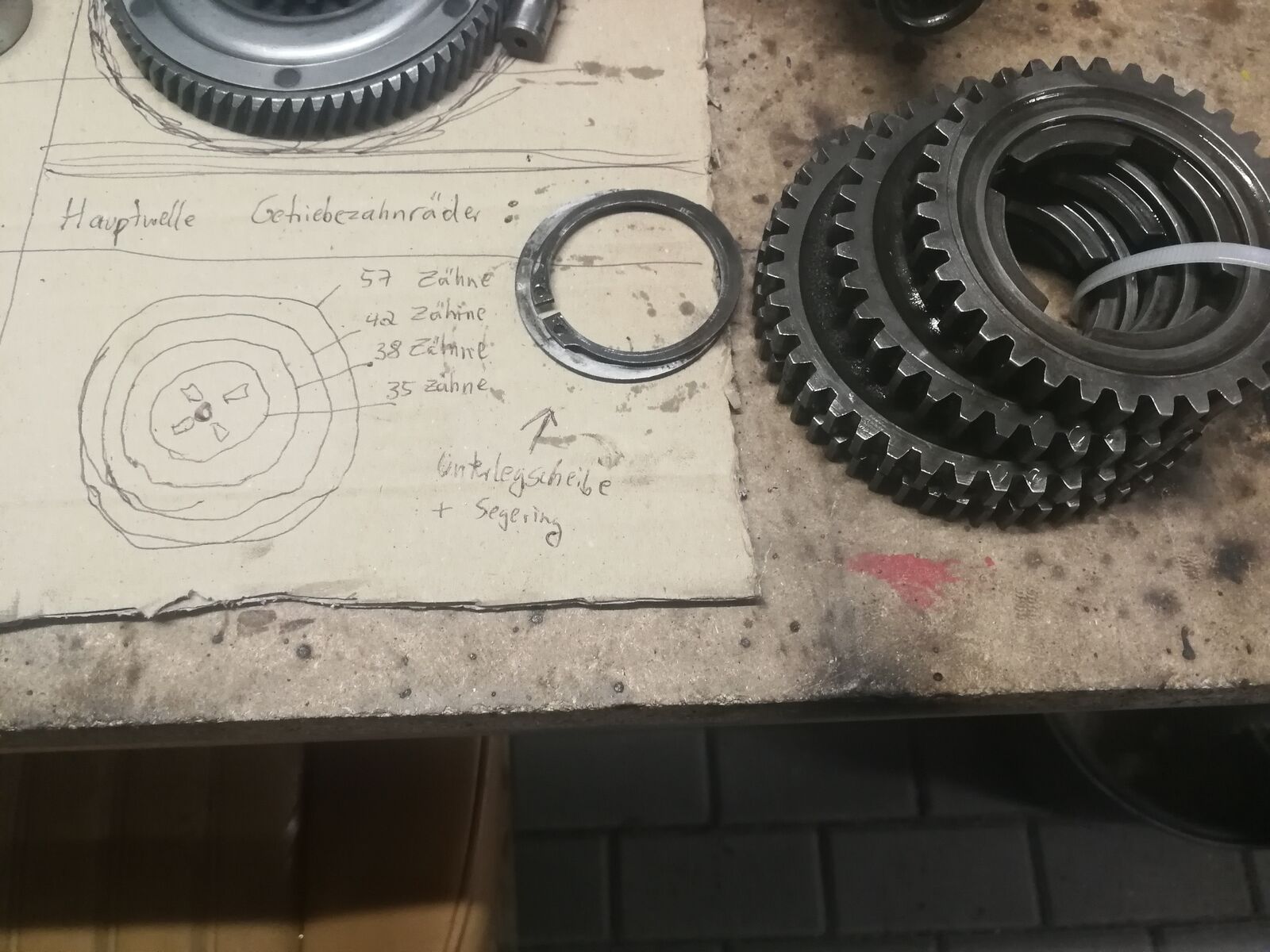 Dazu von der P200E auf der Hauptwelle (1)57/(2)42/(3)38/(4)35. Im Vergleich zu einem originalen P200E Getriebe mit