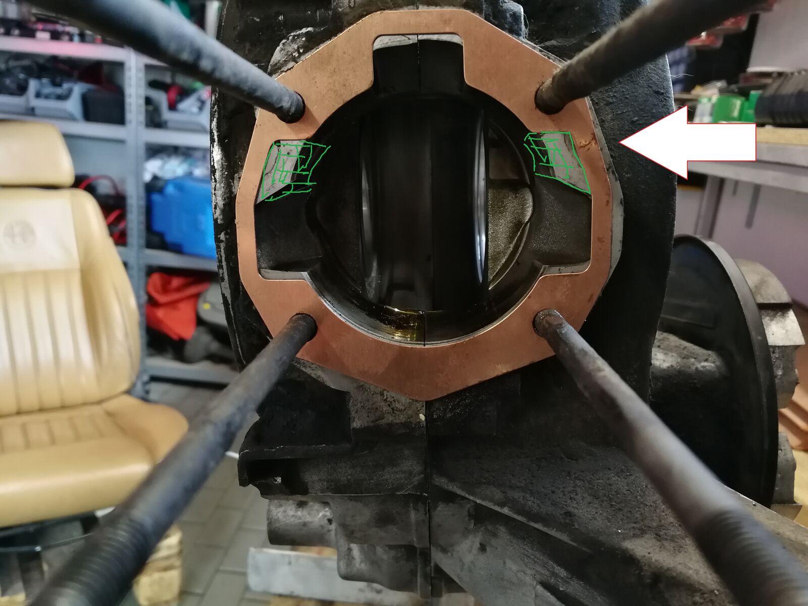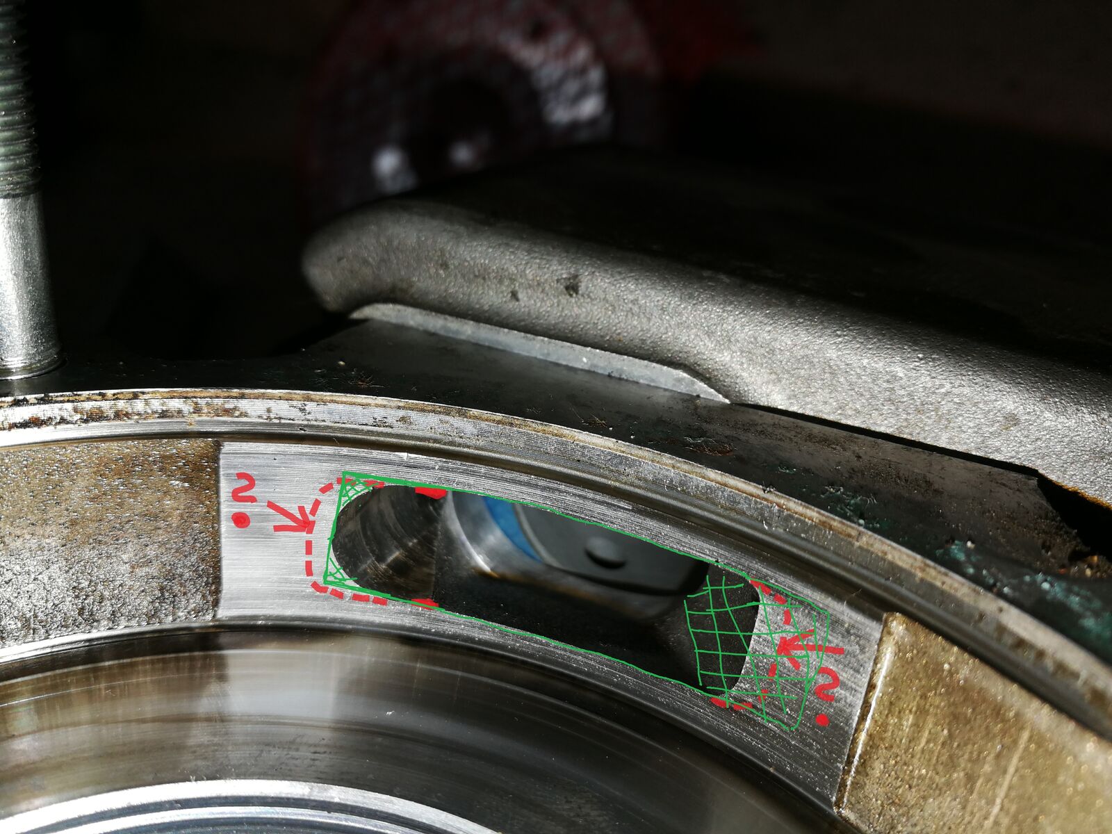 Das Drehschieberloch habe ich nach rechts ein ganz kleines bißchen verlängert. Bzw. eher ein bisschen die Kante gebrochen. Nicht viel, vielleicht 2mm,wenn überhaupt, mehr hab ich mich nicht getraut.