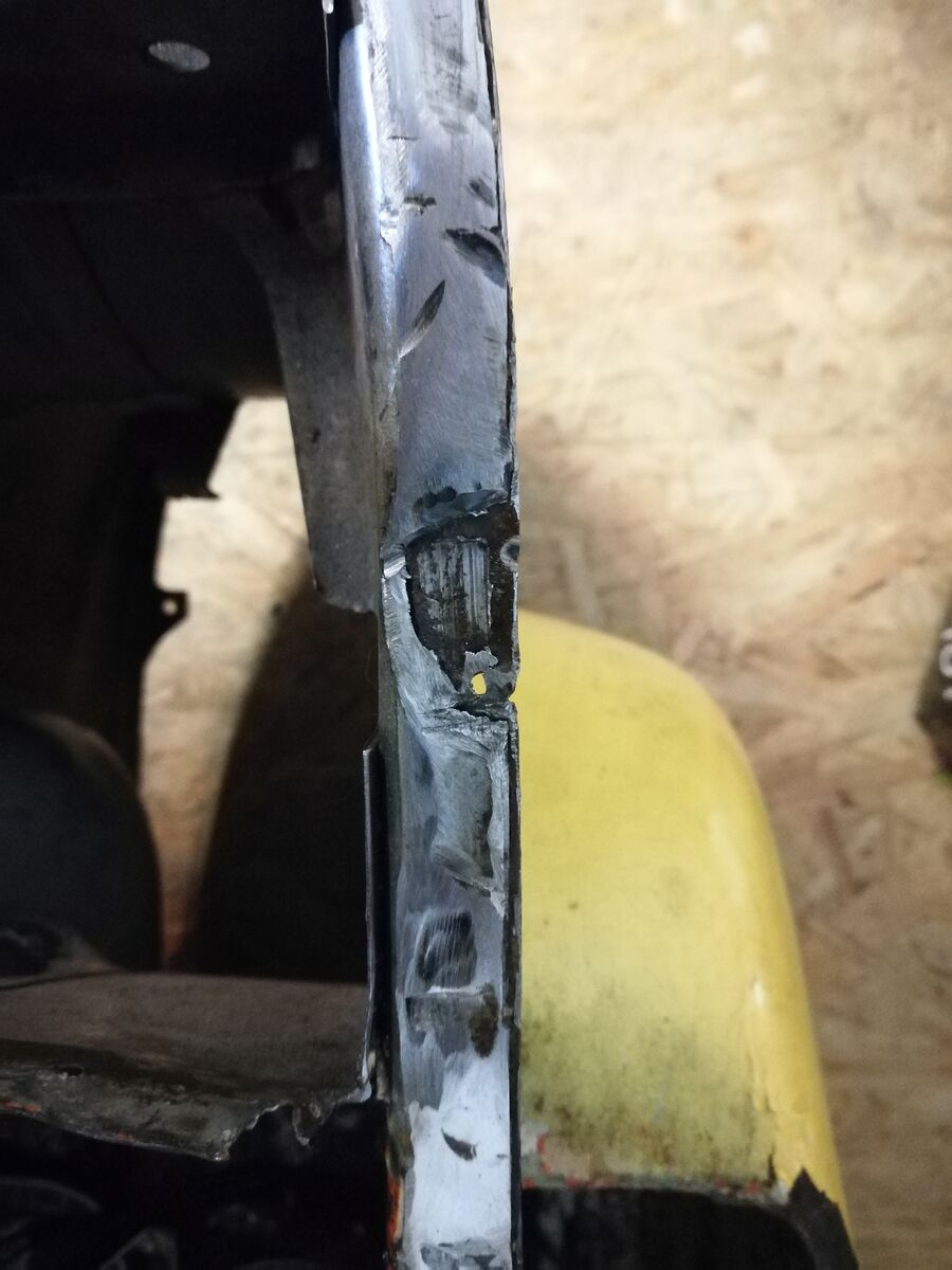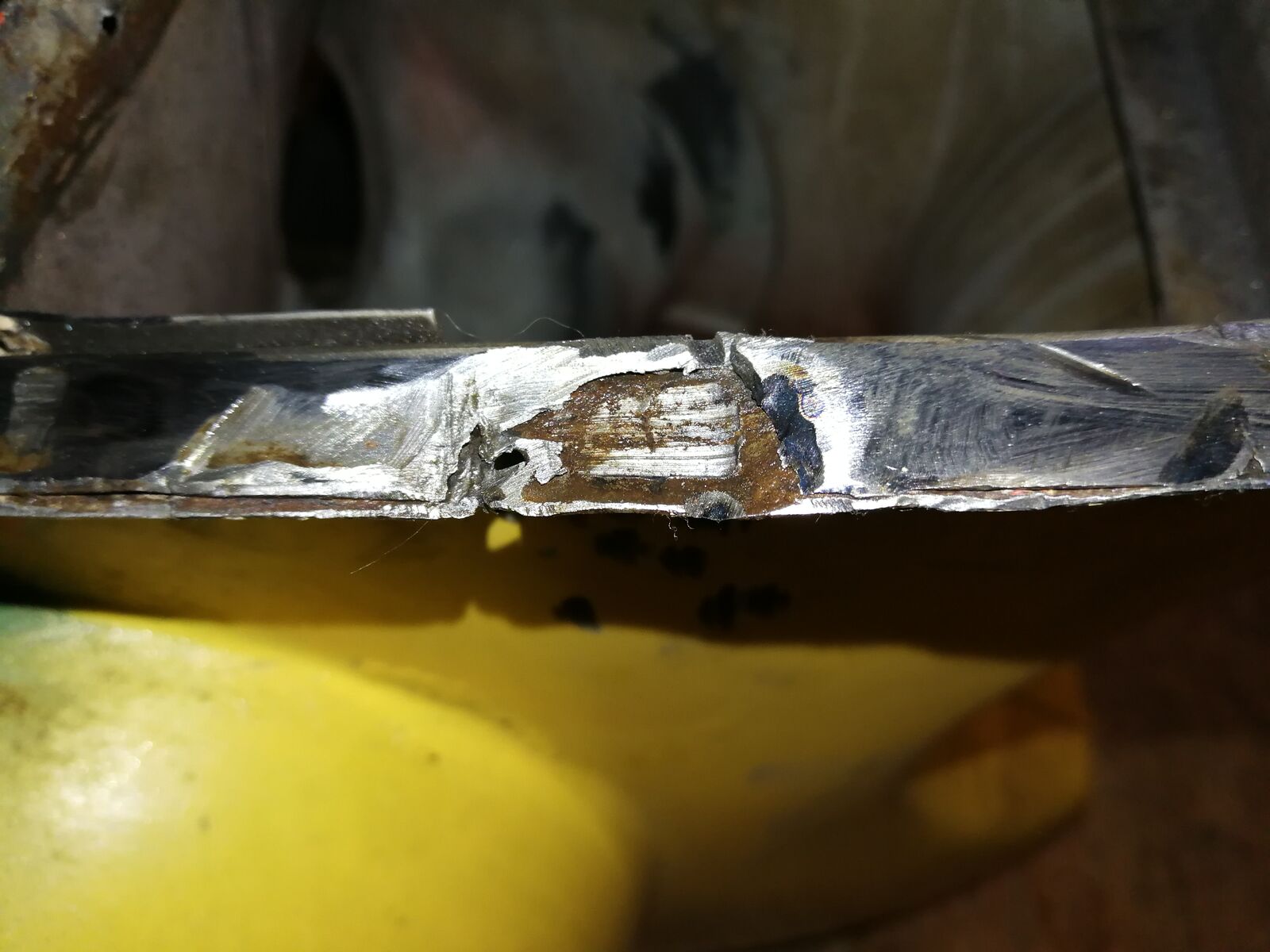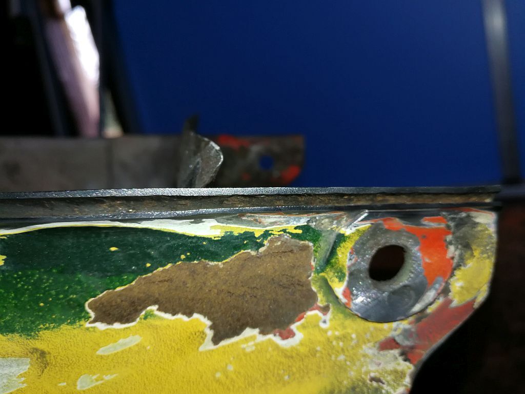 zwischen den Falzen hatte sich gut der Rost eingenistet. Hab dann das Blech großzügig abgetrennt. Im Spalt zwischen den Blechen ist auch noch etwas Rost, den werd ich wegstrahlen und dann ein neues Blech anschweißen lassen, bevor das neue Beinschild drankommt.