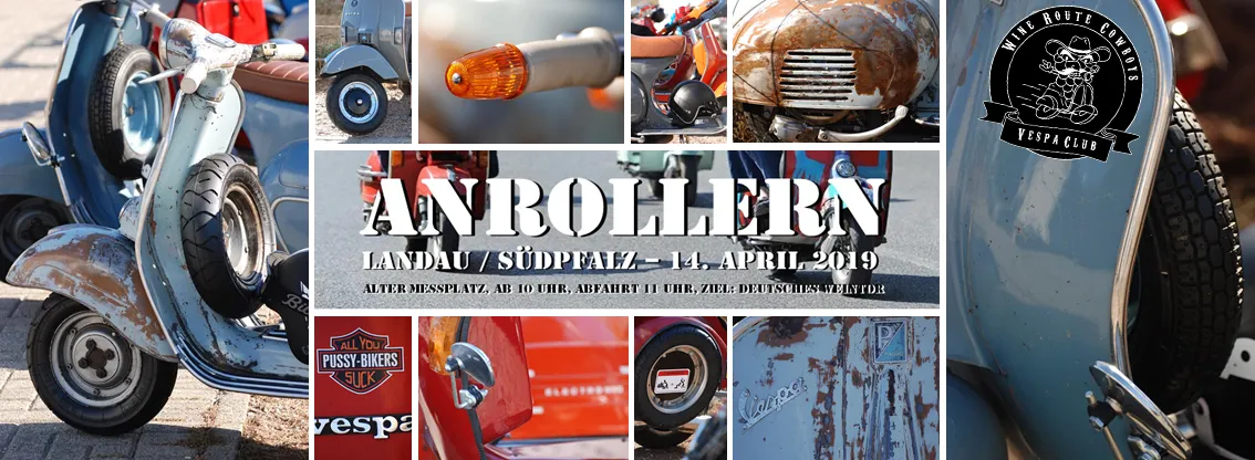 Anrollern für klassische Schaltroller in der schönen Südpfalz. Wir treffen uns ab 10 Uhr am Alten Messplatz, zentral in Landau. Um 11 Uhr starten wir (vollgetankt) zu einer gemeinsamen Ausfahrt, die uns entlang der Weinstraße, durch den Pfälzer Wald und ggf. auch ein Stück durch Frankreich zum Deutschen Weintor in Schweigen-Rechtenbach führt. Dort gibt es mehrere Cafés, Restaurants und Imbisse. Die Haupttour richtet sich an Schaltroller über 80 ccm. Voraussichtlich wird es für Roller mit kleinerem Hubraum eine kürzere Strecke geben, die aber am Anfang und am Ende gemeinsam mit der Haupttour verläuft.
