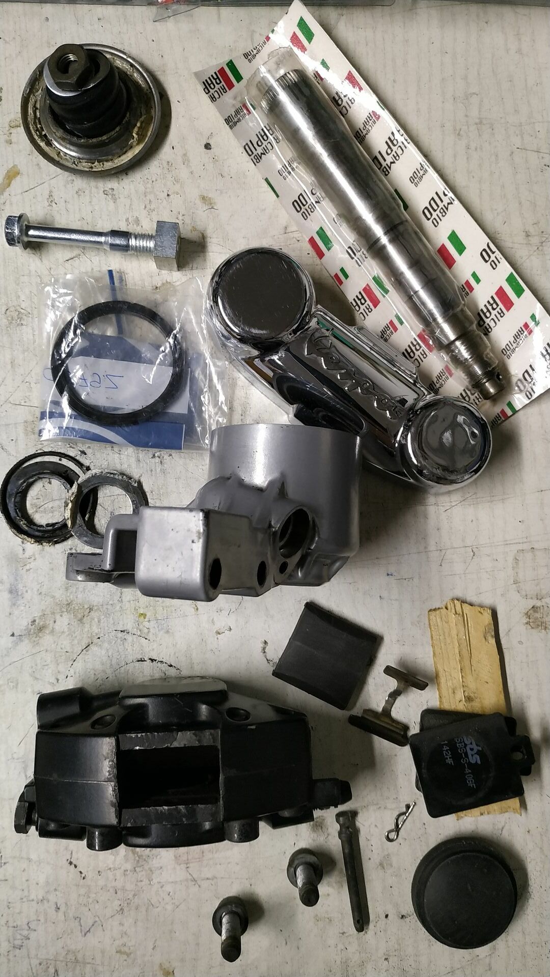 Noch Schrauben und Schlauch besorgen, den Rest wie Grimeca Bremsgeberkolben, Brembo Ausgleichsbehälter, VA Blech, Hülsen, Uniballgelenke mit Innen-/ Außengewinde, Gewindstange und Innengewindehülse sind da.