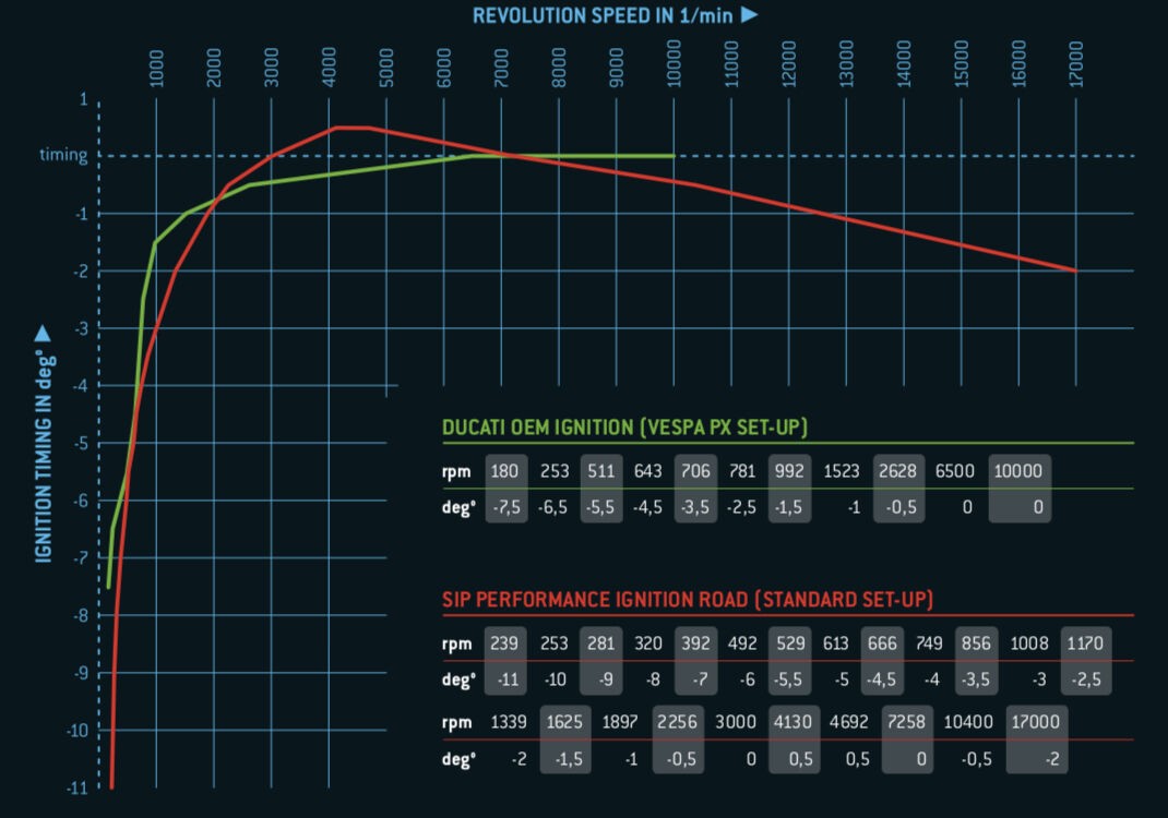 Jetzt heißt es hier immer wieder, dass Tuning-Zündungen aber bei steigender Drehzahl den ZZP nach spät verstellen, also statt -25 eben -11 Grad vOT. Das hat doch aber mit Tuning nix zu tun, sondern eher mit Kastration. Ich verstehe schon, dass das die Temperatur senkt, aber braucht man das bei einem ordentlich abgedüsten Alu-Zylinder?