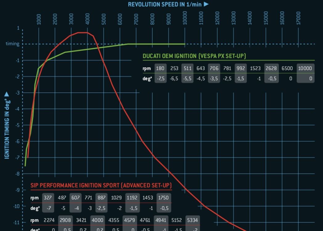 Jetzt heißt es hier immer wieder, dass Tuning-Zündungen aber bei steigender Drehzahl den ZZP nach spät verstellen, also statt -25 eben -11 Grad vOT. Das hat doch aber mit Tuning nix zu tun, sondern eher mit Kastration. Ich verstehe schon, dass das die Temperatur senkt, aber braucht man das bei einem ordentlich abgedüsten Alu-Zylinder?