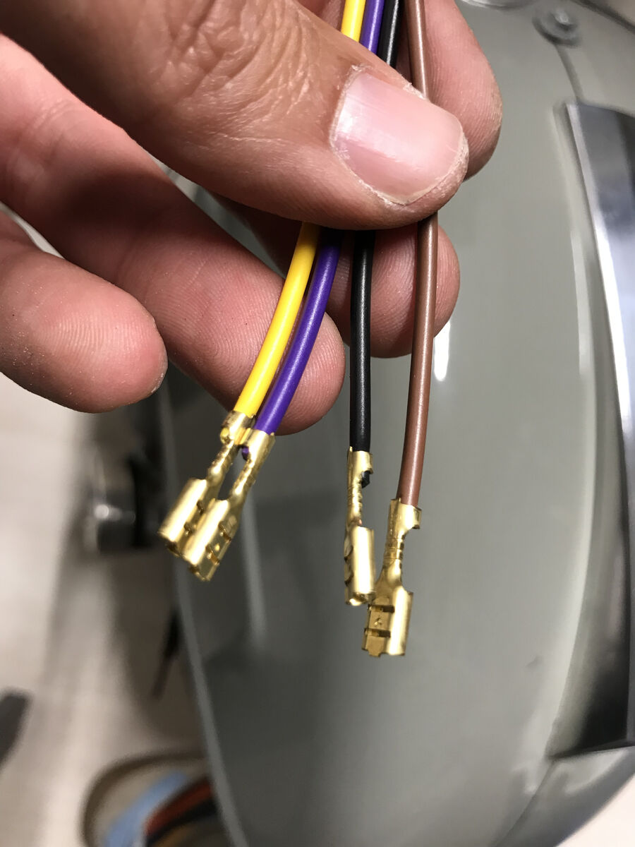 • Braun und lila sind für Auf -und Abblendlicht. Im falle einer V50 nutzt ma da ein Kabel für den Scheinwerfer (egal ob braun oder lila) das andere Kabel isoliert man vorne am Kabelast ab. Wenn man dann den Schalter betätigt ist in einer Stellung das Licht aus in der anderen an.