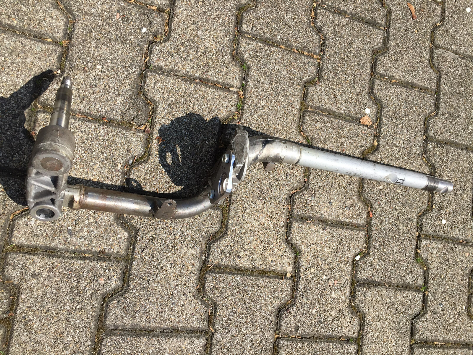 Den Umbau hat Roberto1 aus dem GSF gemacht, wirklich gute Arbeit - Roberto hat schon viele Gabeln für diverse Modelle angepasst. Gabel ist oben und unten jeweils gekürzt, Gewinde oben verlängert, Lenkschloss-Nut angepasst und Lenkanschlag unten angepasst, das ganze für möglichst wenig Spurversatz verdreht geschweißt. Schwinge unten zusätzlich überholt. Adapterplatte für 145er PK Dämpfer geb ich auch dazu.