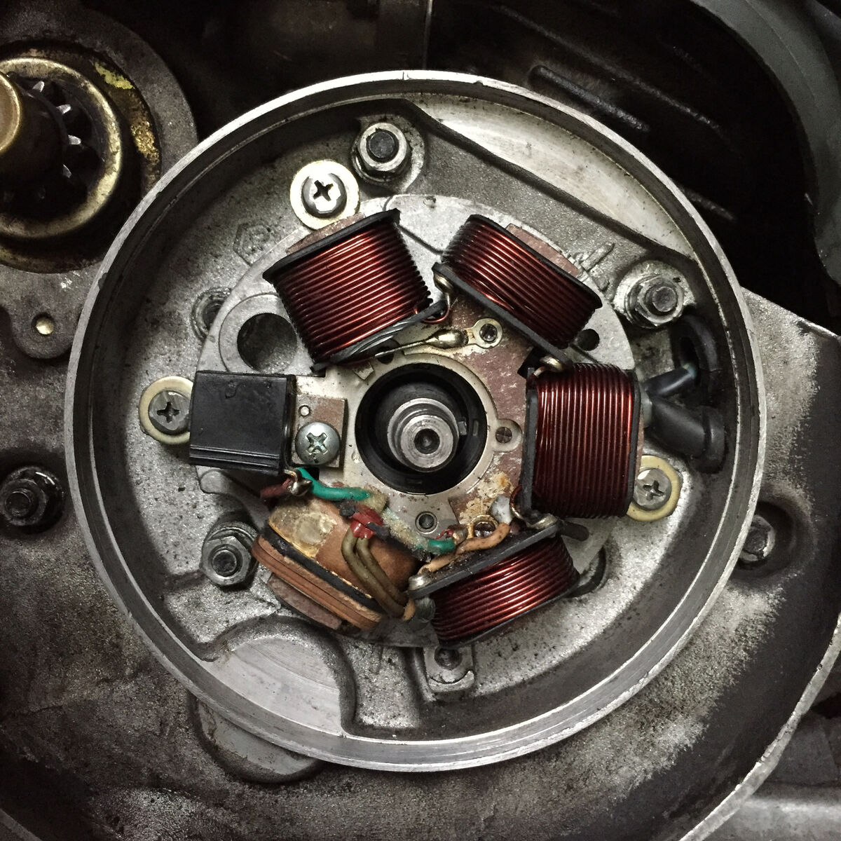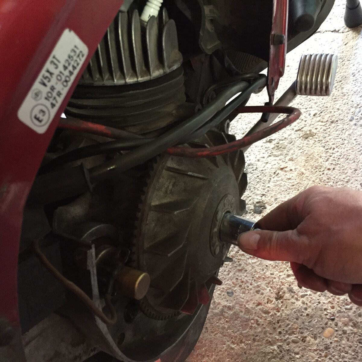 Um mir die Vespa etwas genauer anzusehen, begann ich sie zu zerlegen: Zylinderhaube ab, wegen der Zündung unters Lüfterrad schauen ...