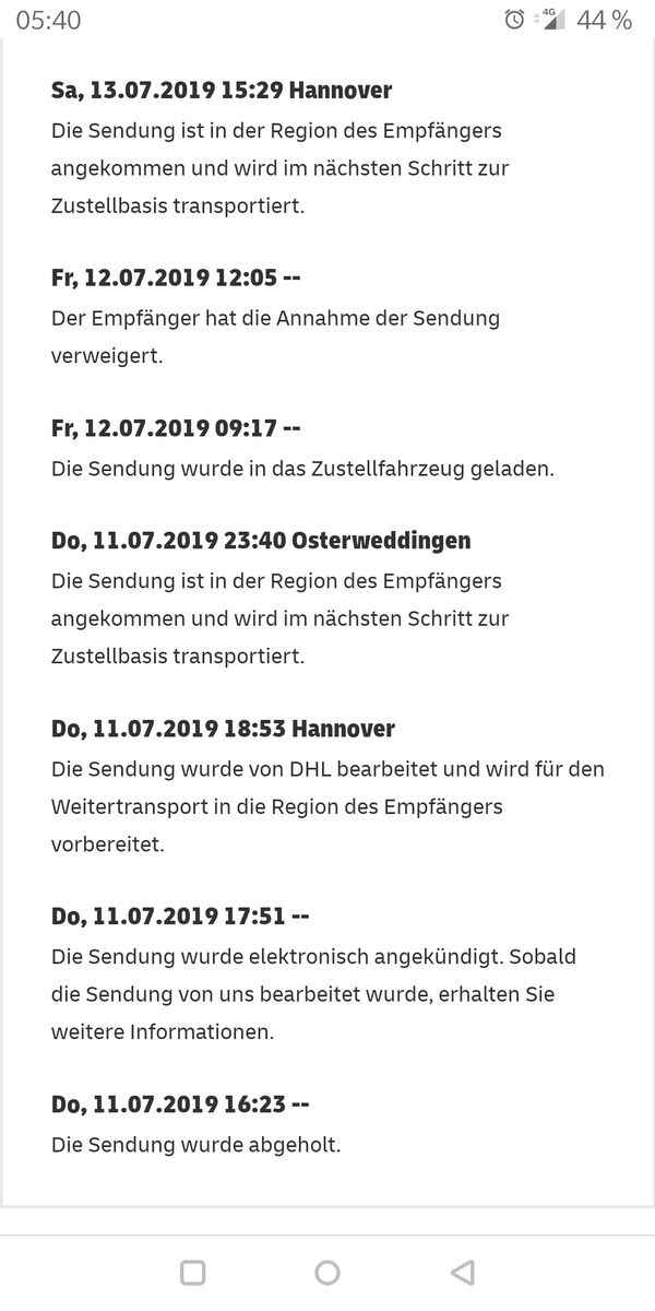 DHL hat die Sendung am 11.07. abgeholt und der Empfänger hat am 12.07. die Annahme verweigert. Dann geht es zurück und ... keine aktuelleren Daten als dass am 13.07. transportiert werden soll (ganz oben)?