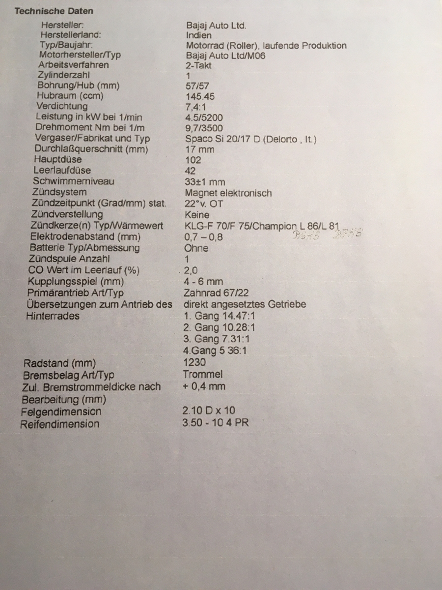 Das sind die Eckdaten deines Bajaj Zylinders und die Vorgaben bezüglich Zündzeitpunkt und Zündkerze allerdings in Kombination mit dem orig. Spaco SI 20/17D!