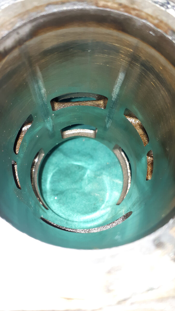 Der tiefste Cut am Kolben liegt exakt in Pfeilrichtund und beginnt am Kolben Dach, geht über die zwei Ringe und weiter runter am Hemd.