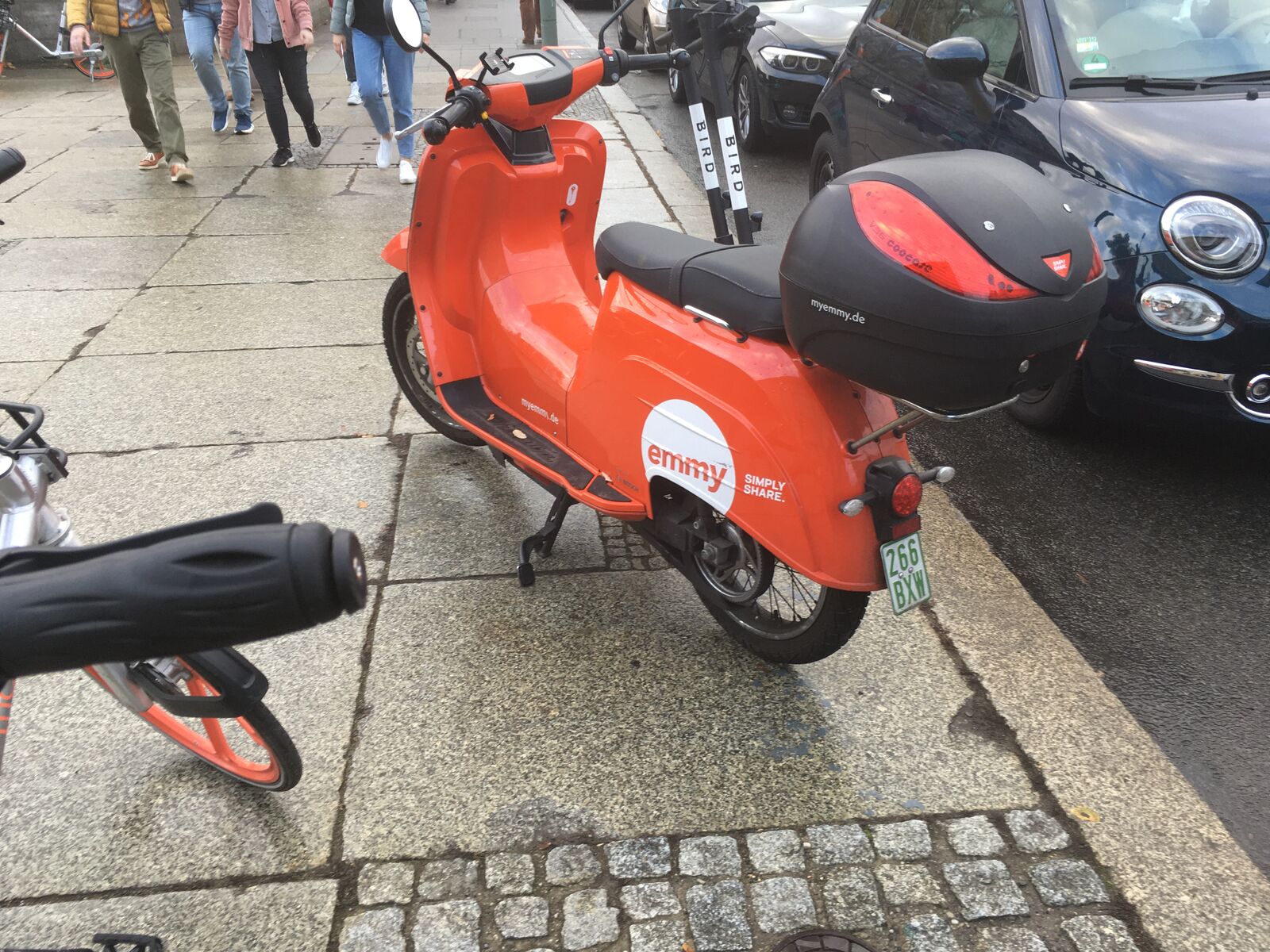 Steht und fährt auch in M und fällt dort regelmäßig auf die Nase. Die Damen und Herren, die das leihmäßig fahren, sind in nassen Kurven und bei Straßenbahnschienen schon sehr optimistisch unterwegs...
